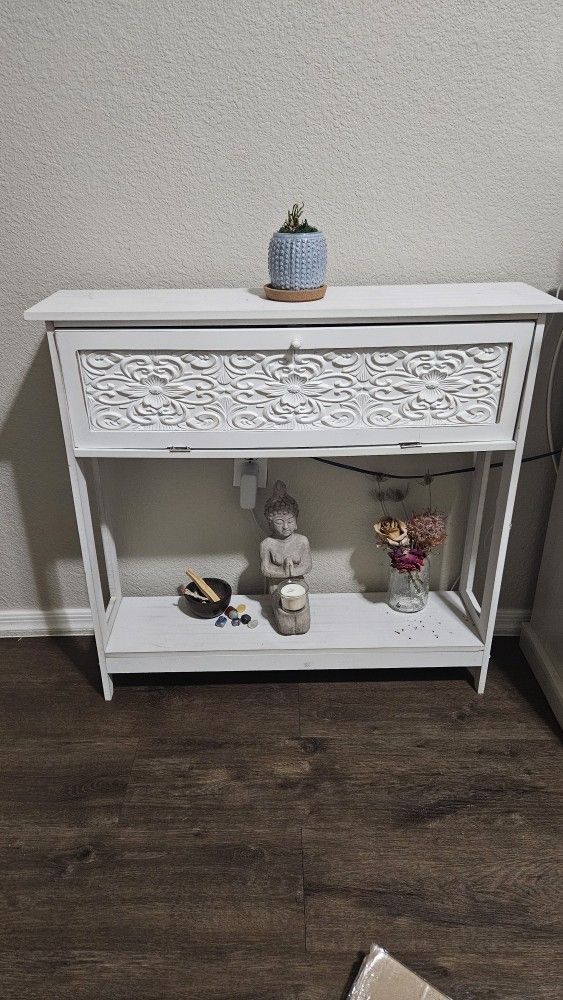 A shelf at the bottom of this carved console table is perfect for displaying framed photos, floral arrangements, collectibles or other items Intricate Carved Design The narrow hall table features an intricate carved design on the door, which drops down to reveal a storage compartment.