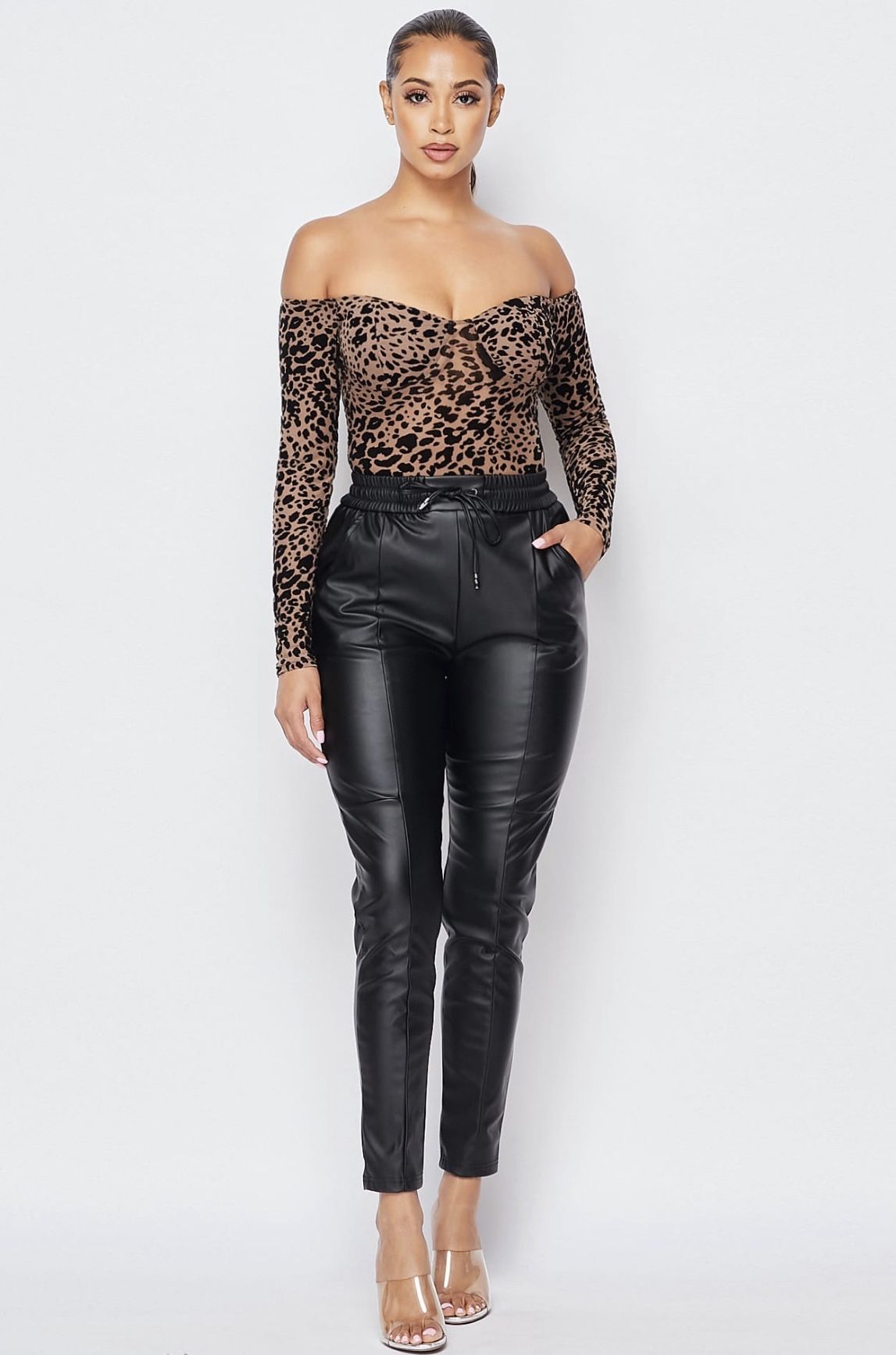 These leather jogger pants go perfectly with any top! Good quality material Edgy and stylish 100% vegan leather Available in the color black Has adjustable Drawstring front tie Available in Small, Medium.