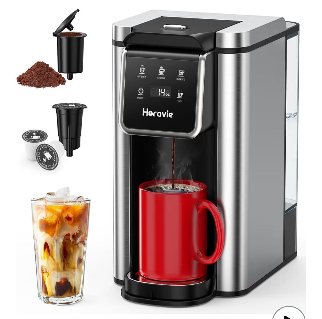 Cafetera de una sola porción para cápsulas K-Cup y molidos, cafetera caliente y helada, función de botón fuerte, tamaños de preparación de 6 a 14 onzas, tanque extraíble de 50 onzas, taza de
