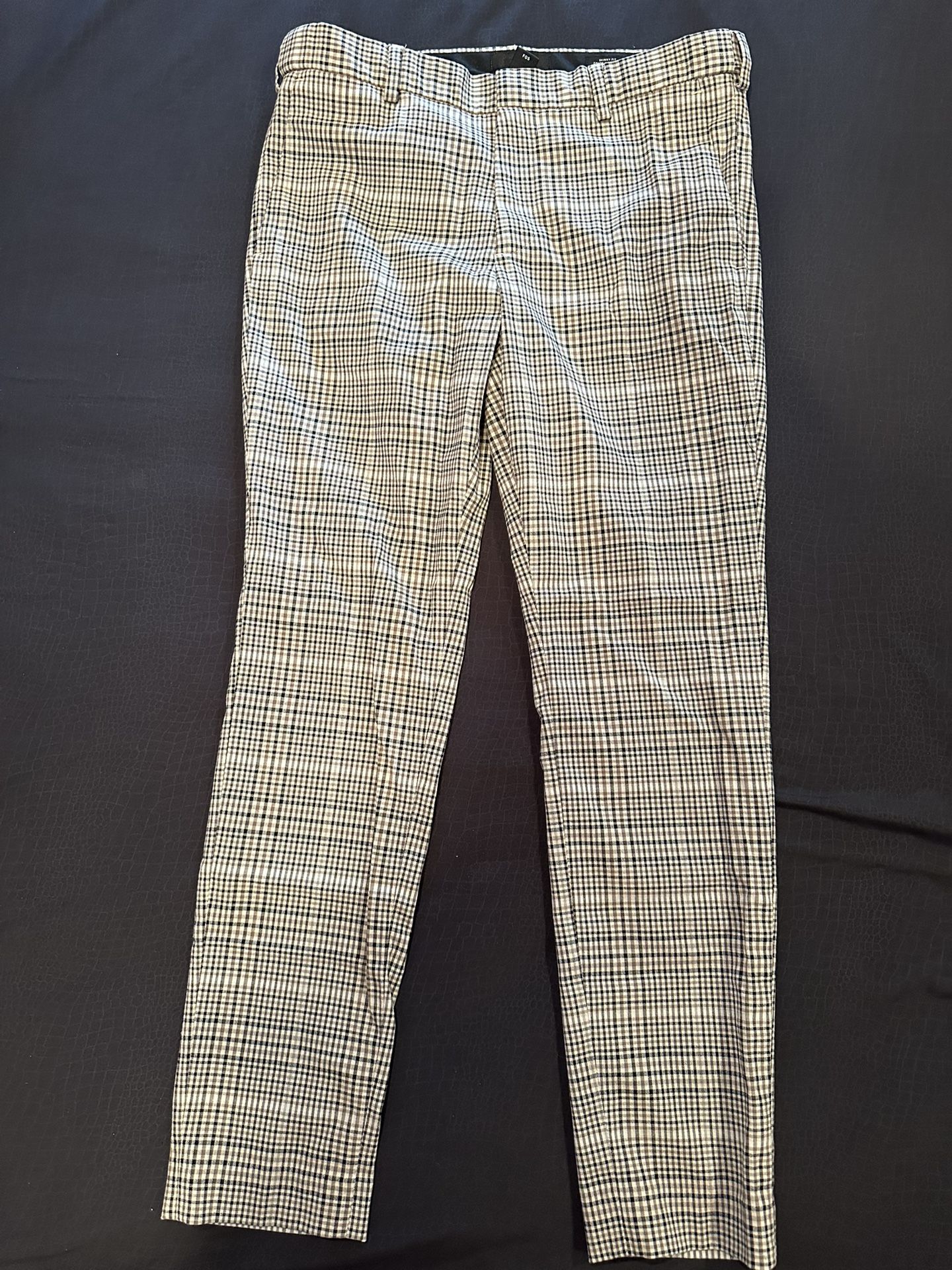 Neutral tan/black micro-check pattern, flat-front, slim-tapered leg, belt loops, two side pockets + two back welt pockets, zip fly with button. Subtle stretch for comfort. Fabric tag: 65% polyester / 33% viscose / 2% elastane; lining 100% polyester. Size: Fits like 30×31 on me Fit note: I’m 6’2” / 150 (slim). These sit at the waist with a tailored leg—easy for business-casual or dressy streetwear. Closet-kept, smoke-free