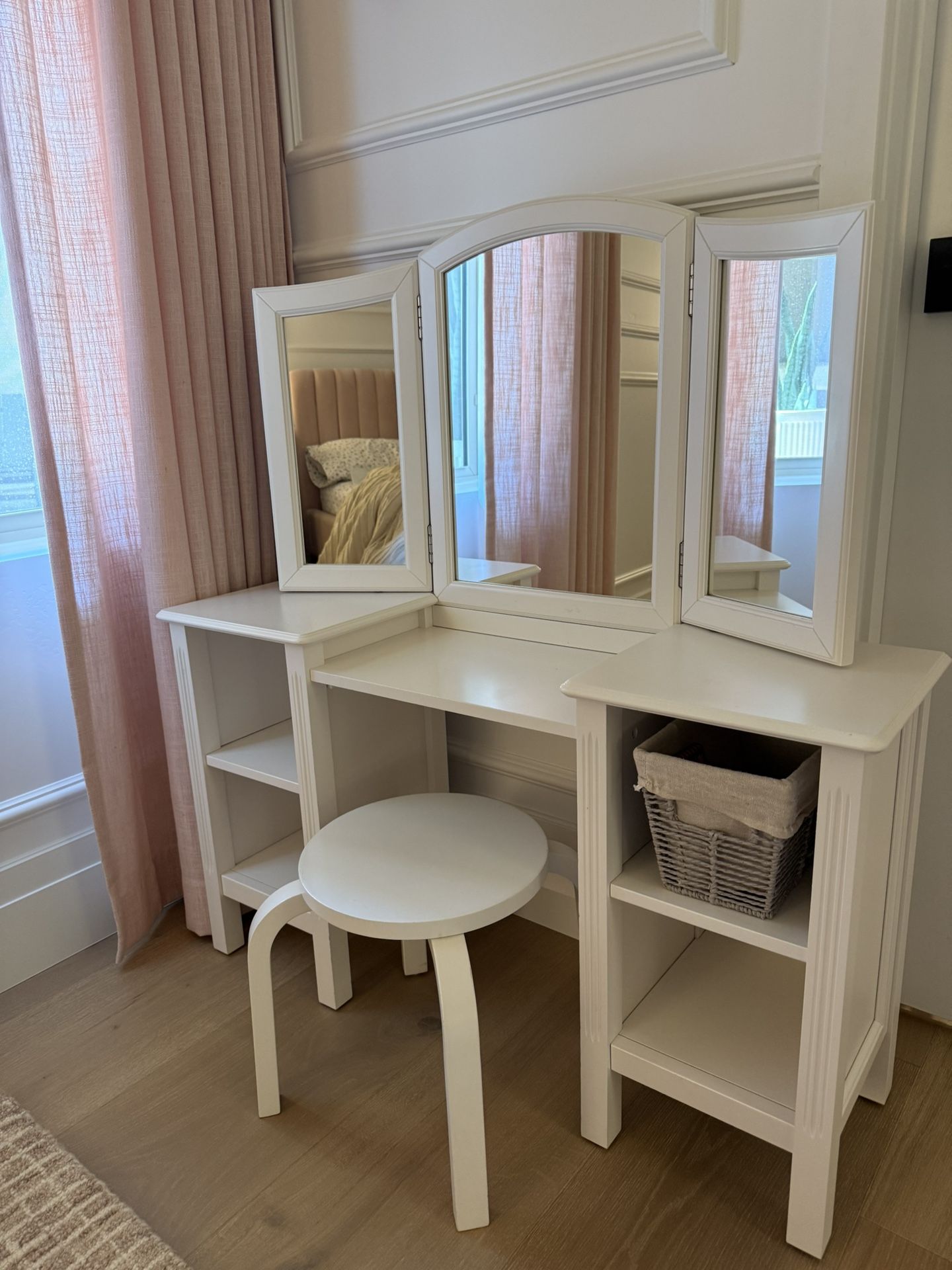 Cute white vanity set from Pottery Barn. In great shape! Dimension: 11.5 deep, 22” tall, 37.5” wide. Side mirrors move