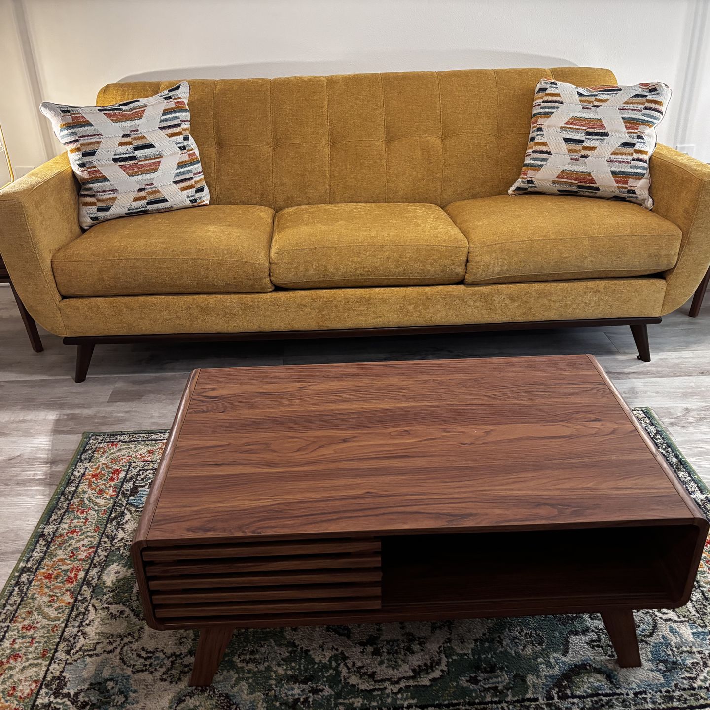 Everything EXCEPT small white framed tv in photo. Moving, all must go. Please be able to move and transport. Smoke free and pet free home. 55 inch TV, Couch, TV stand, Coffee Table, 2 end Tables, 2 Bar stools, Bed Frame (Please be able to dispose of mattress) Green & Yellow TV stand, Green & Yellow flower chair, 2 night stands, 4 lamps (2) Gold (2) Black. Outdoor swivel chair with cushions. I have a few more small miscellaneous items not listed. $350 is for everything.