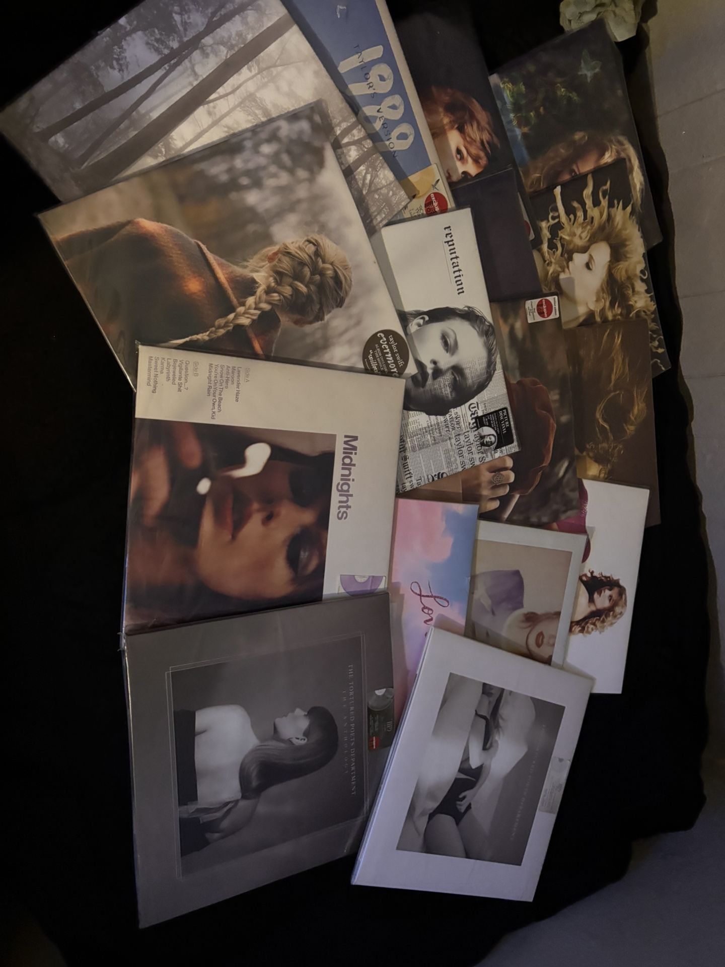 MESSAGE FOR PRICES PLEASE, THEY VARY. Every single Taylor Swift album on vinyl, including the originals and taylor’s version. includes rare translucent green evermore pressing and gold fearless tv pressing, folklore beige, and reputation photo disc. all unwrapped with original sticker intact and protective vinyl sleeves for the records included