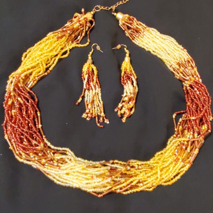 Multi Color and Multi layer Seed Bead Necklace Set Cooper Tone Metal Closure & French Hooks Size: 25" L Metallic Gold, Yellow, Beige Seed Beads Matching Earrings: French Hook 4" Long