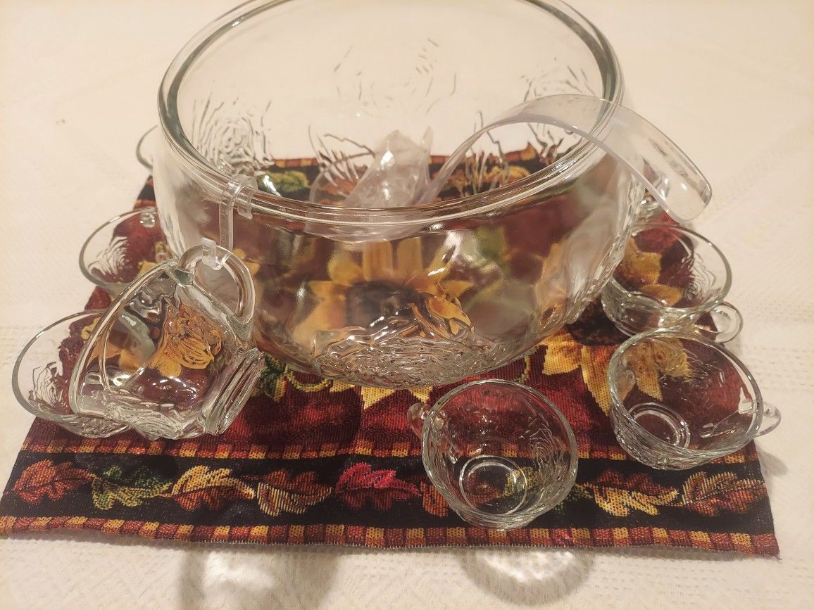 14 pc Heavy Glass Punch bowel w cups and hanger. Absolutly beautiful unit.