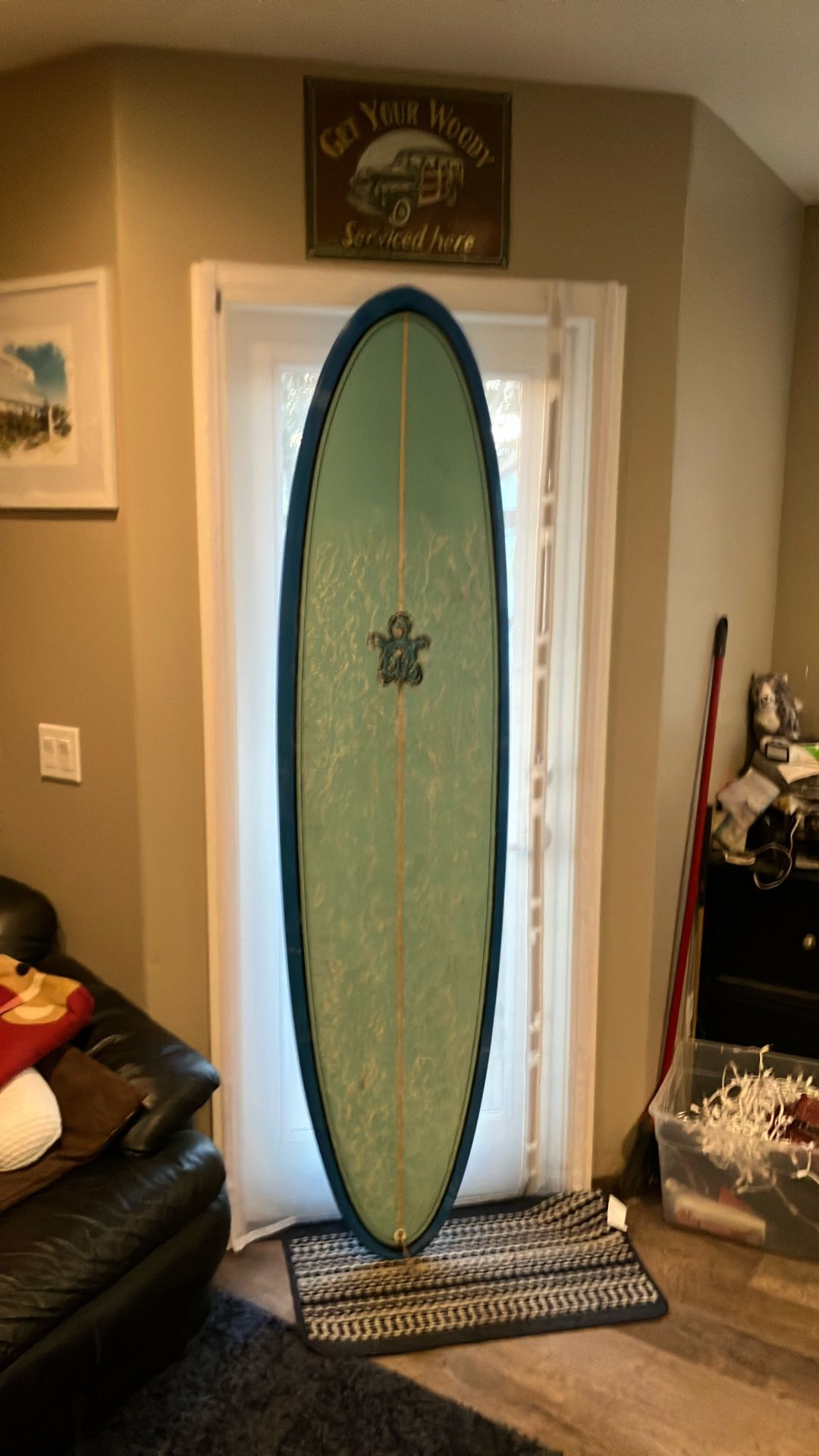 6.8’ fun board old school color resin pigment and pin lines fcs side fins center fin box . Super fun board . Only selling have bad knees fins includec