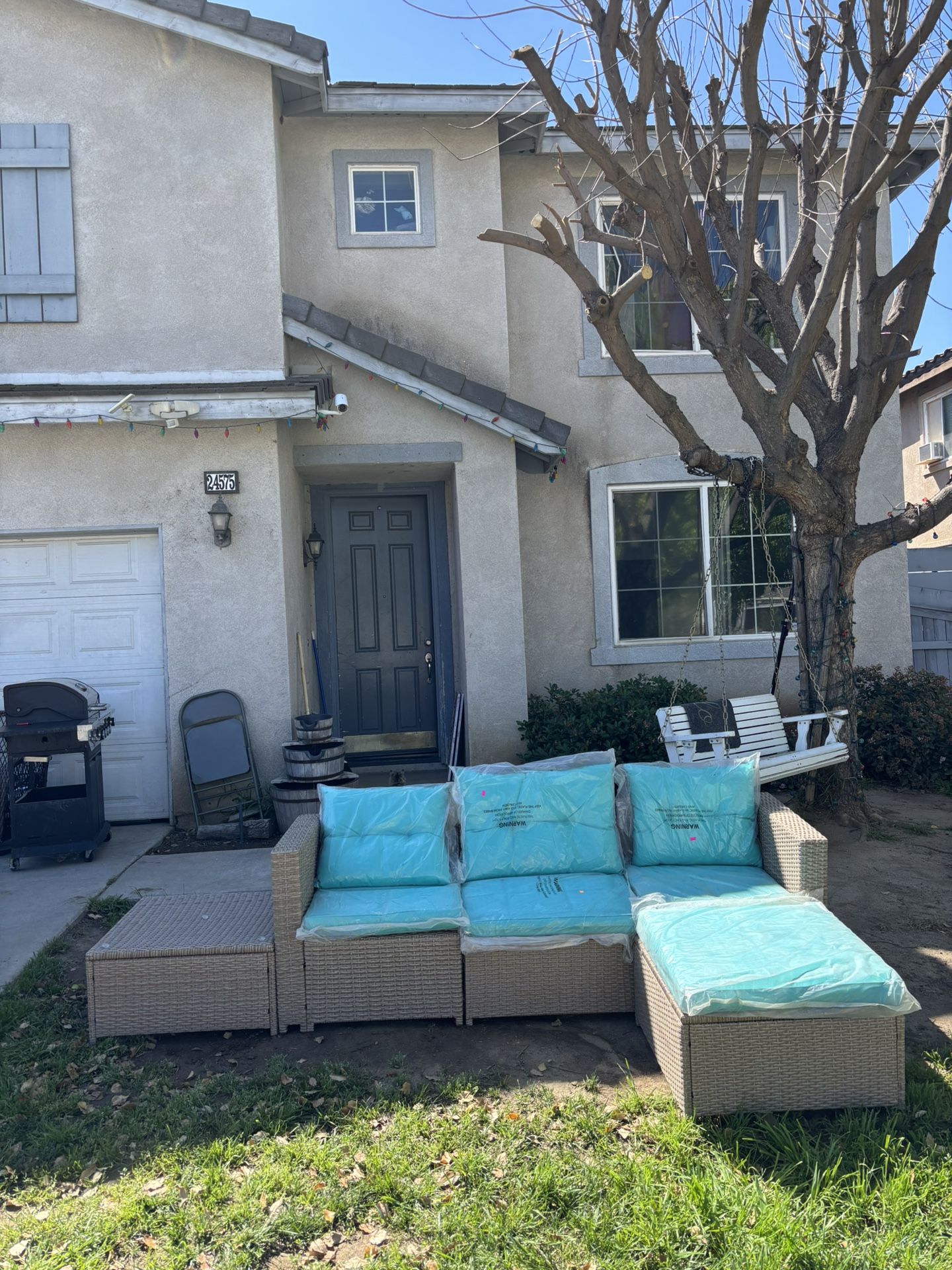 Brand new sectional outdoor patio furniture set light brown frame with light blue cushions Pickup from my home in Moreno Valley or I can deliver it for a small delivery fee depending on where you’re located 2 corners 1 middle 1 ottoman And 1 glass coffee table