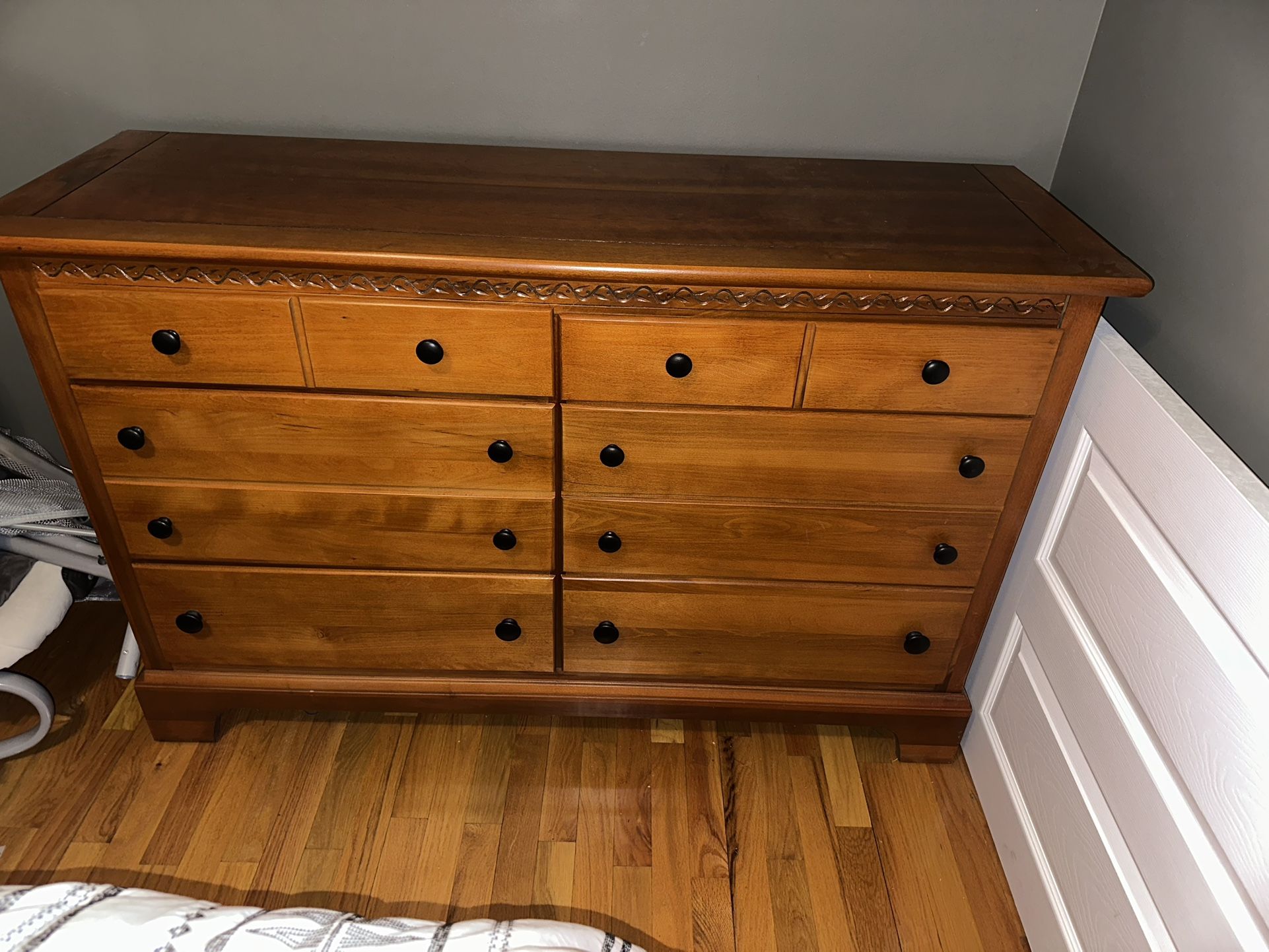 Solid cherry double dresser. Excellent condition, single owner. Always in guest room so hardly ever opened/used. 2 superficial scratches on top, pictured. 53- 5/8” wide 18” deep 34” tall