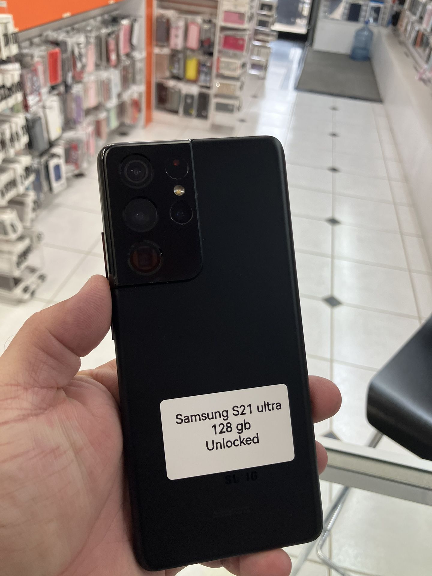 I'm selling a Samsung S21 ultra with 128GB of storage. It's unlocked for any carrier. The phone comes with a cable and a one-month warranty.