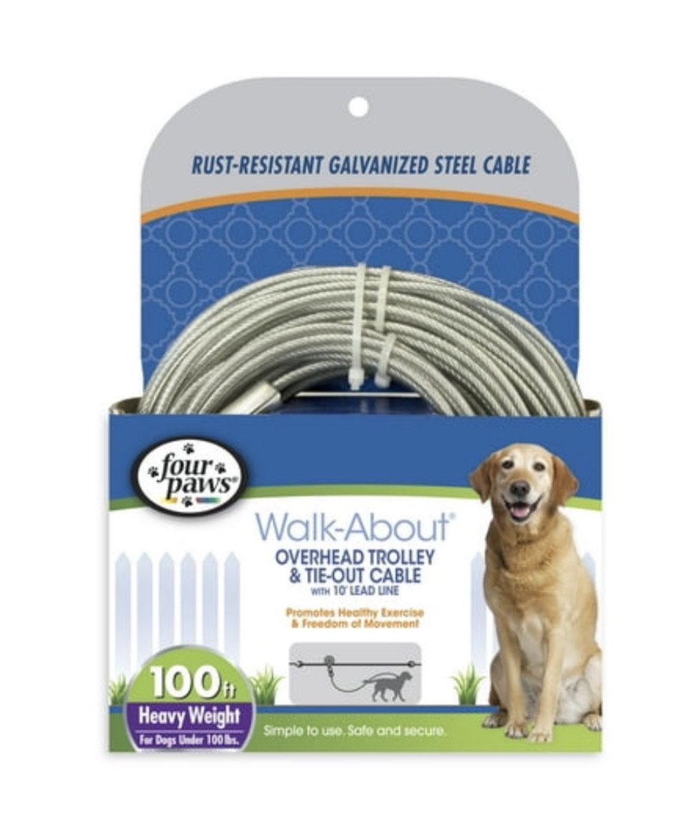 Don't let your fur kid feel cooped up! No fence? No problem! Let your dog safely roam outside with the Four Paws Heavy Weight Dog Run Cable! This tie out cable for dogs allows your fur kid to sniff around, exercise, and explore outdoors while staying safe and contained. The rust-proof dog run cable is made of durable aircraft cable and includes a 10-foot pulley lead. A big dog cable perfect for large backyards and dogs more than 50 pounds. • Outdoor dog cable made of durable, vinyl-coated aircraft cable • Long-lasting, rust-proof dog tie out won't fray • Gives your dog freedom, safety & exercise • Heavy duty dog cable with 10-ft pulley lead that supports dogs more than 50 lbs. • 100-ft tie out cable for large dogs