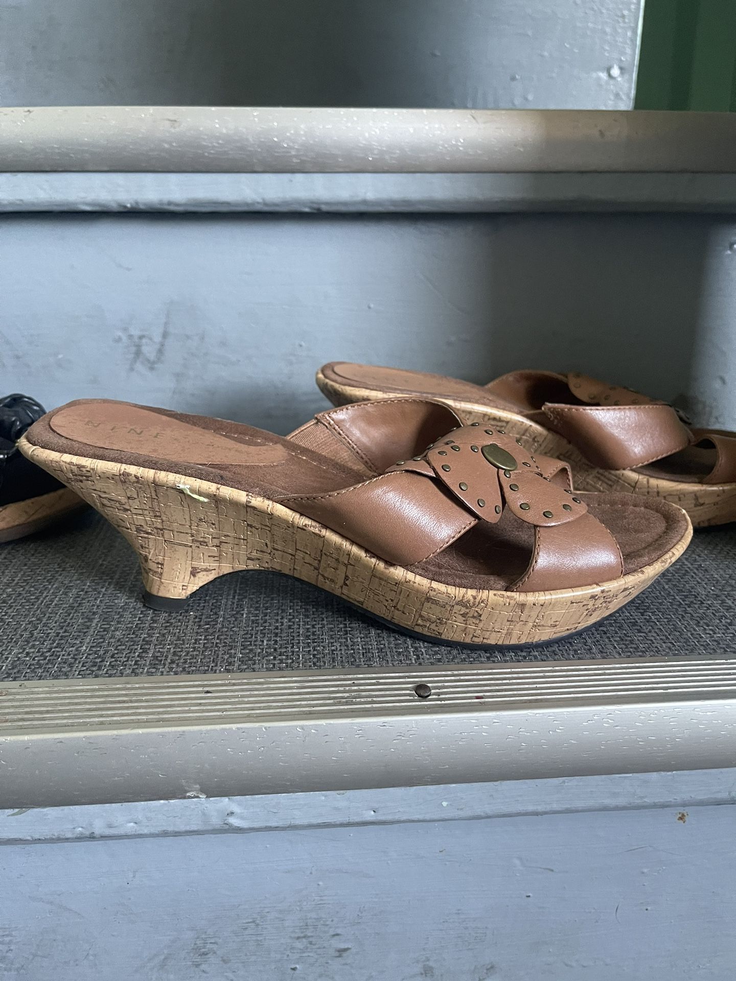 Black boots size not sure it only has a number 38 on the bottom of the boots Brown sandal brand is nine & company