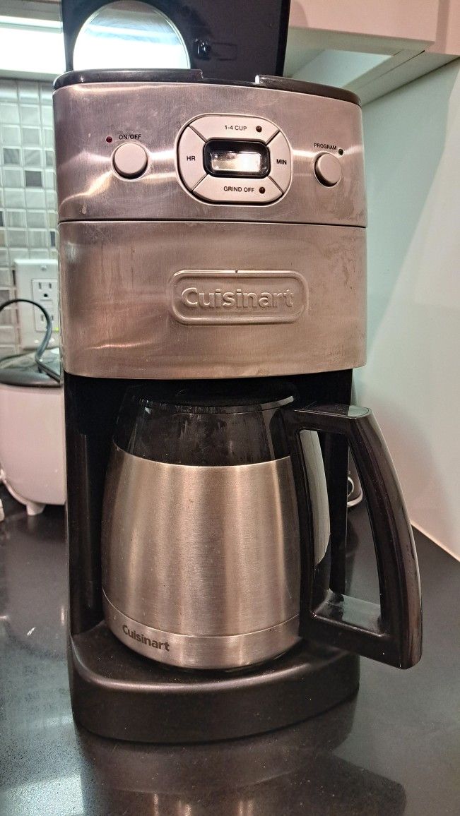 Gist for mom, too complicated. Used twice. This item is a Cuisinart Grind & Brew Thermal 10-Cup Automatic Coffeemaker, specifically model DGB-650BC. Integrated Grinder: Automatically grinds whole coffee beans immediately before brewing for maximum freshness. Thermal Carafe: Features a double-walled, stainless-steel thermal carafe designed to keep coffee hot for hours without a heating plate. Programmable Features: Includes a 24-hour programmable timer, brew-pause function, and a 1-to-4 cup setting. Grind-Off Option: Allows for the use of pre-ground coffee instead of whole beans.
