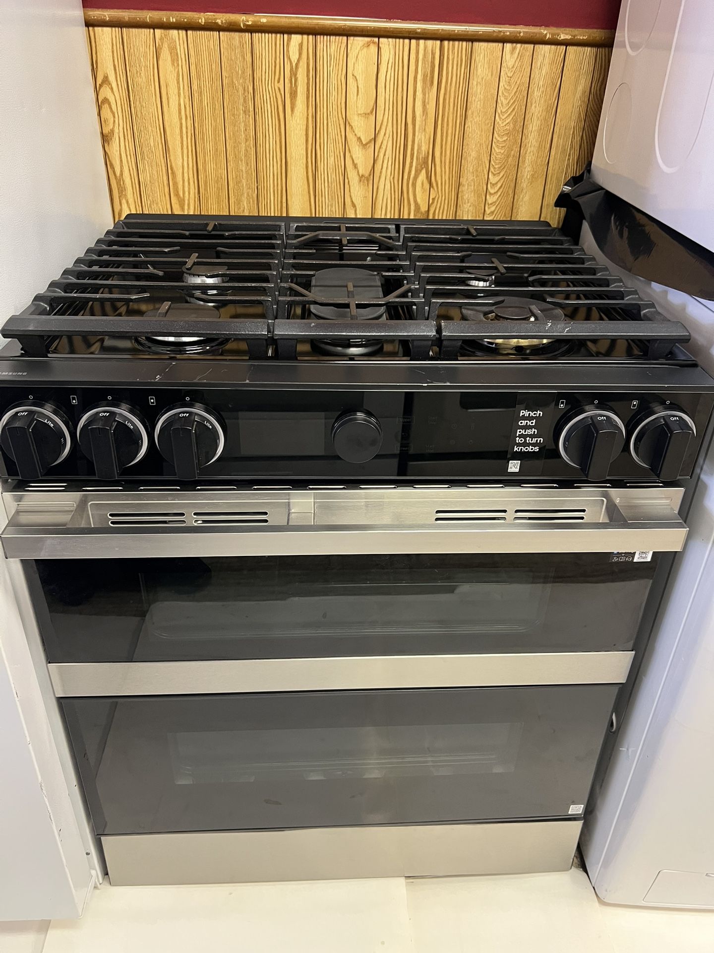 30” Wide, gas range, self clean oven, 5 burners, Double oven and griddle.