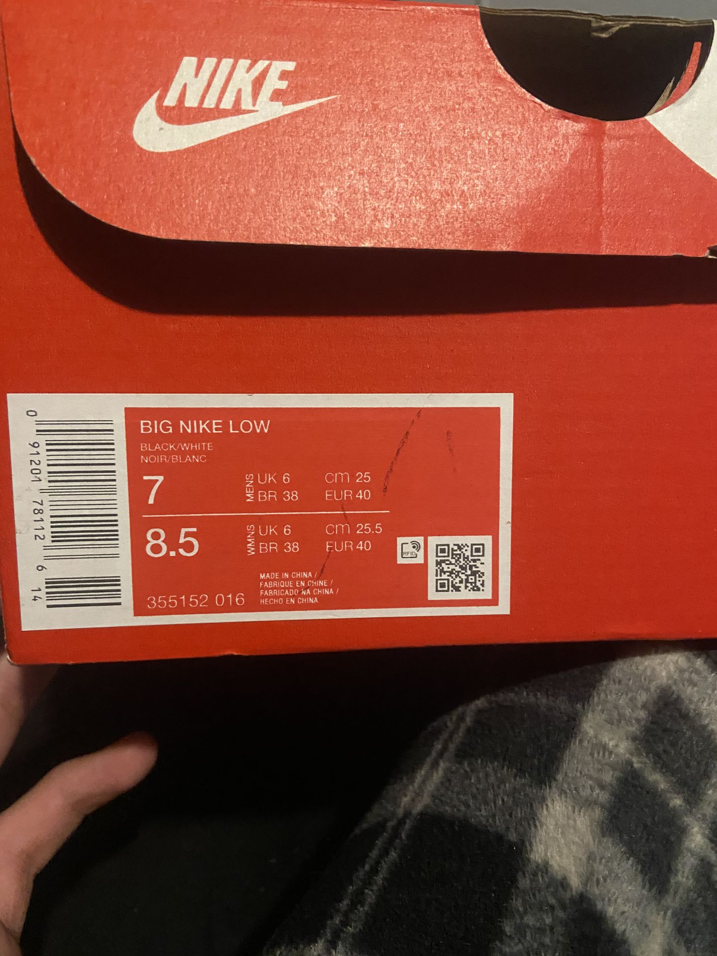 Brand new never worn Big Nike Lows. Size 8.5 in youth. Box has a bit of damage but the shoes are perfectly fine and still brand new. 75$ price is negotiable!!!