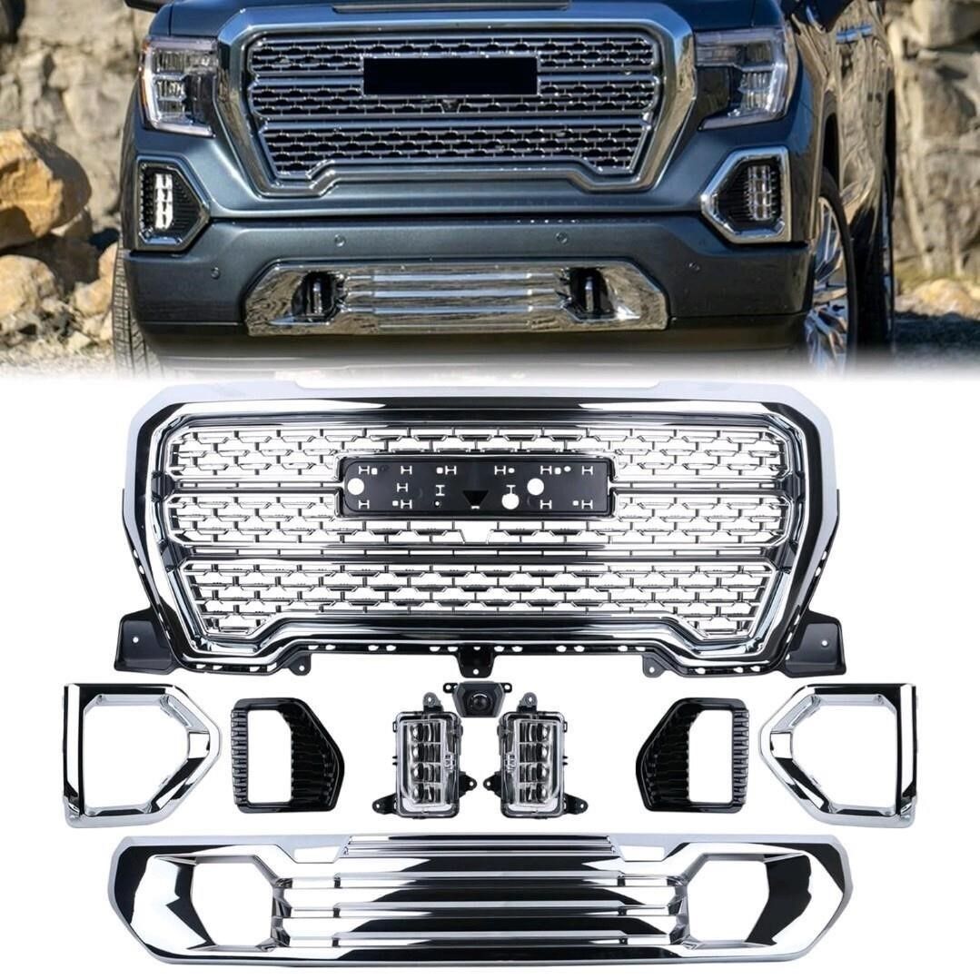 Description with 2021 2024 GMC Yukon/Yukon XL Denali Front Upper Grill Upper Lower Hood Molding Trim Camera bracket Fog Light Bezel Fog Light Covers Chrome Kit $250