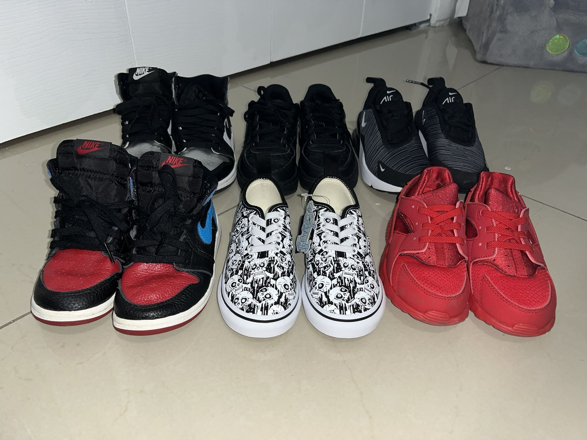 Blue/red 1s size 10c lightly used Vans size 10 never worn Huarache size 10 never worn Black/silver 1s size 11c lightly used Black forces size 11c lightly used Air max 270 size 11c never worn