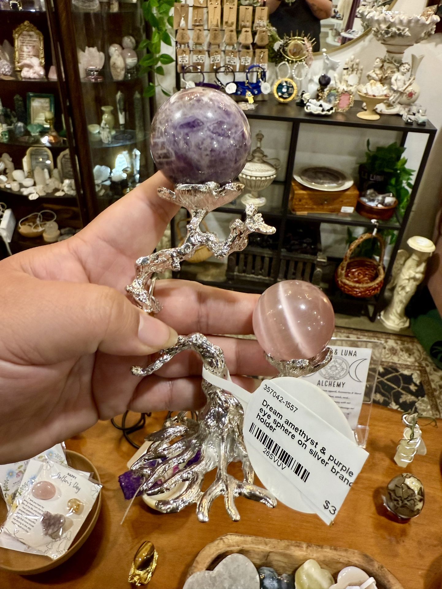 Two beautiful spheres, amethyst & purple cat eye, have been safely & permanently secured to a sturdy silver branch/ tree of life holder perfect and ready for display without worry of spheres falling or rolling away.