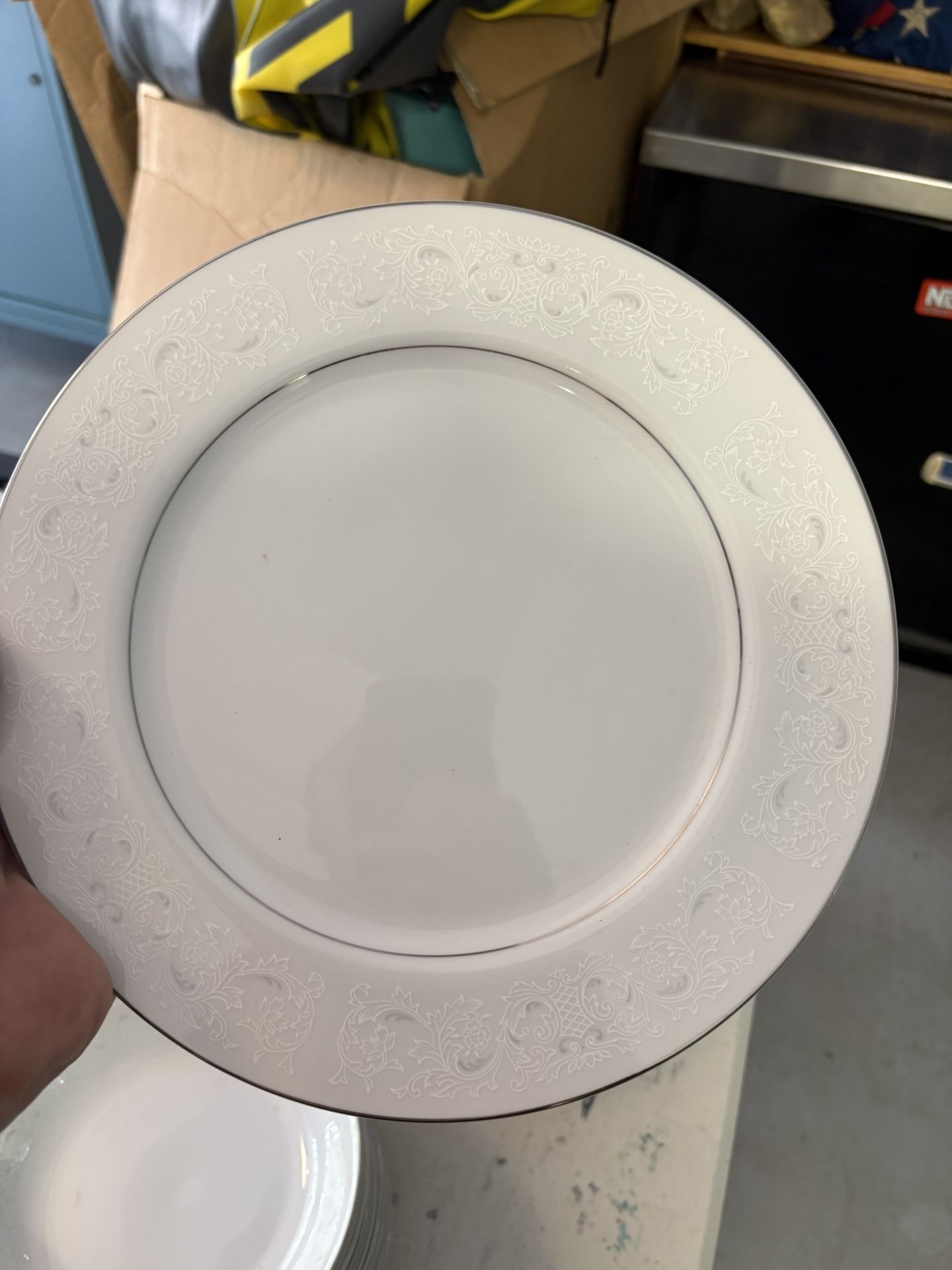 79 piece set of 12 dinner plates, 12 med plates, 12 sm plates , 12 lg bowls, 12 small bowls, 11 saucers, 2 tea cups, salt and pepper shaker, gravy dish and creamer.