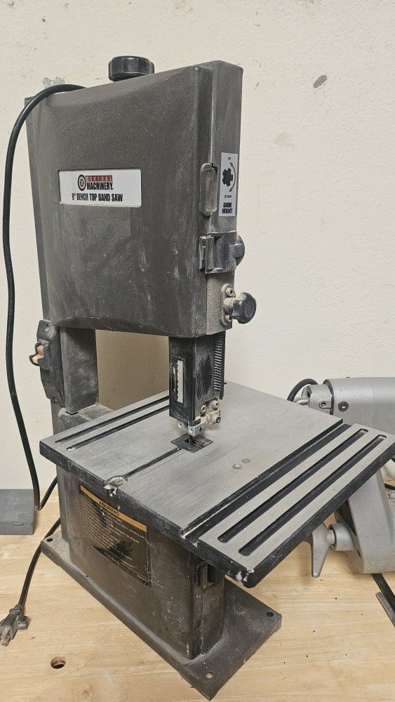 Central Machinery 9" bench top band saw for woodworking and cutting projects. Part of a business closing sale, pickup is at business location (in an industrial office block).