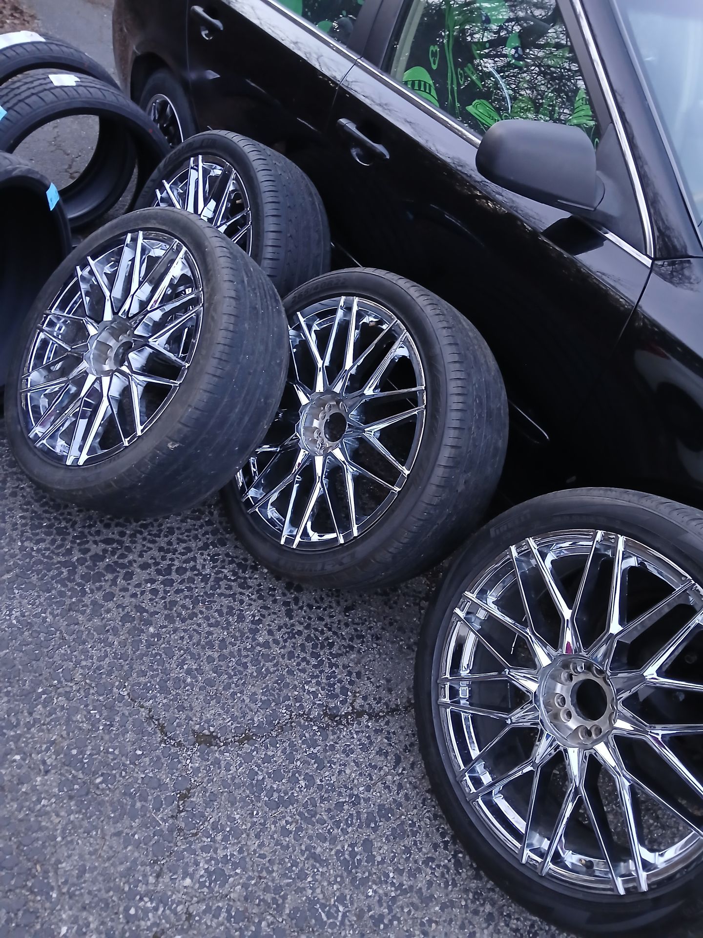35 offset, 22×8.5 width, 5×120 bolt size 5x114.3 universal Tires is 265/40R22... condition is worn