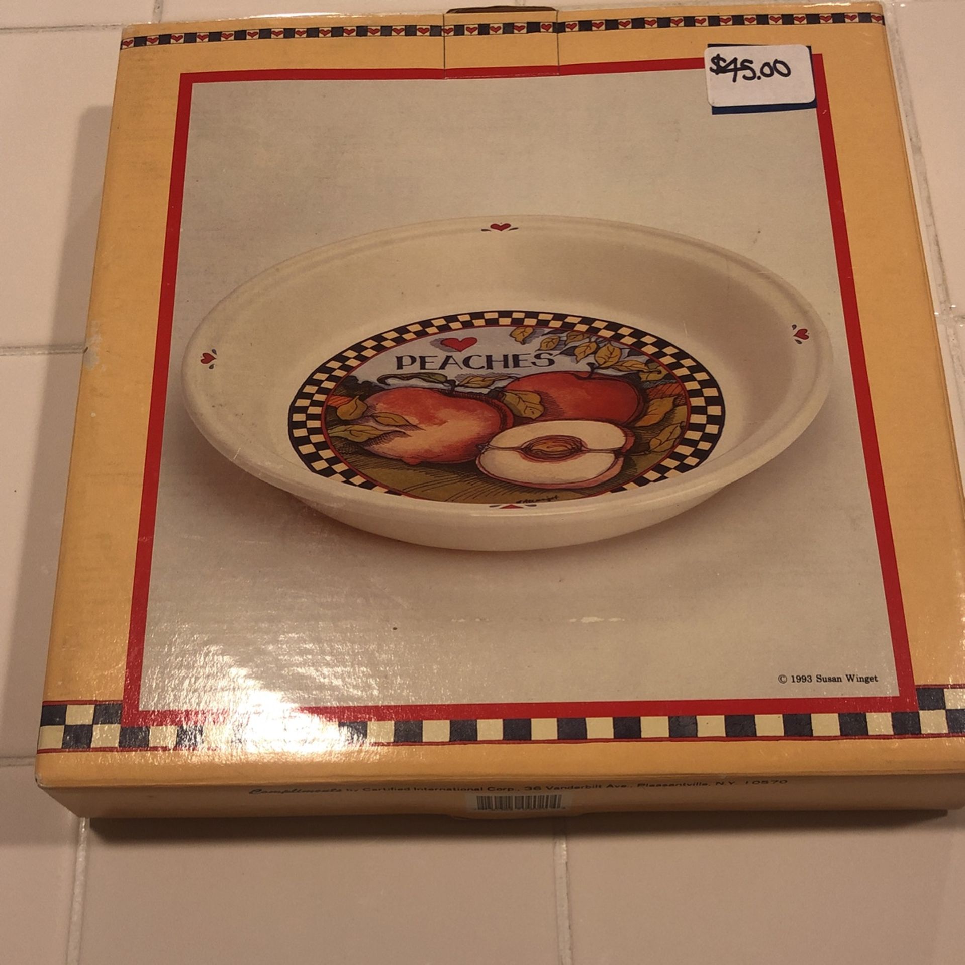 Certified SusanWright Pie Plate in the Box Brand New. Item number 9020 no chips or cracks , beautiful design measures 11 inches wide and 2 inches deep.