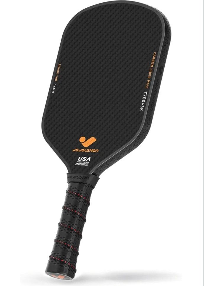 OPTIMIZED PERFORMANCE DESIGN: JOJOLEMON pickleball paddles are expertly crafted to provide top-tier performance and comfort. Built with carbon fiber, this paddle delivers an exceptional playing experience for players of all skill levels. PREMIUM TORAY T700SC CARBON FIBER: Introducing the Shark 100 Paddle, made from 3K raw carbon fiber for exceptional strength and stability. It’s perfect for intense play, giving you the edge you need on the court! TEXTURED 3K CARBON WEAVE: The textured 4-directional carbon fiber weave provides strength and rigidity in all directions, enlarging the optimal striking area and minimizing dead spots. EXTENDED HANDLE FOR POWER: Ideal for two-handed backhand players, the extended handle improves balance and provides extra leverage for more powerful swings. ACCESSORIES USAGE INSTRUCTIONS: Black Block (Eraser): Cleans the paddle's carbon fiber surface. Gently rub to remove dirt. White Tape (Replacement Grip): A new grip for the handle. Remove the old one and wrap this on. Orange Tape (Overgrip): Adds a sweat-absorbing layer. Wrap it over your current grip for better comfort and grip. LIGHTWEIGHT PRECISION: Weighing just 8 ounces, this paddle offers quick responsiveness, easy handling, and powerful shots, making it a must-have for any serious player. ENHANCED SHOCK ABSORPTION: With a 16mm polypropylene honeycomb core and foam edges, this paddle absorbs impact effectively, delivering smoother, more controlled shots for precision play. THERMOFORMED DURABILITY: Our thermoformed design creates a single-piece paddle for enhanced durability and stability, making it more resistant to breaking and setting it apart from standard pickleball paddles. USAPA APPROVED: Each Shark 100 pickleball paddle is built to USAPA standards and features a USAPA certification label, ensuring it's ready for international championship play. JO-SHARKTEX GRIP: Featuring a shark-scale-inspired grip, this paddle ensures a secure, non-slip hold while providing superior comfort.