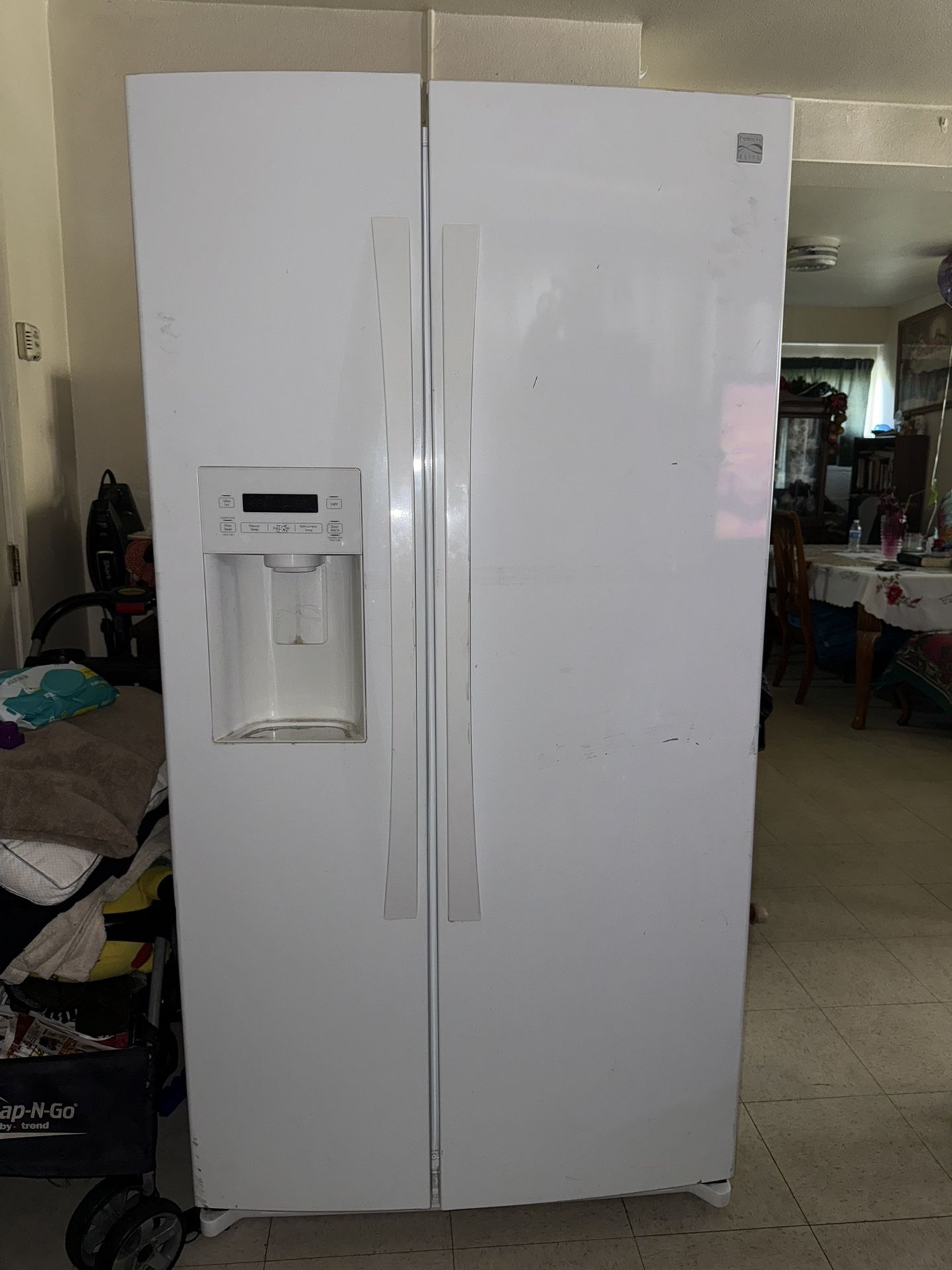 Fridge for sale, excellent, works well. Very Cold. 2 Doors. Used but taken care of. A few scratches on the side, no breaks on the inside shelves. Has ice machine, and water filter. Plenty of storage space. Need gone! Moving away. Must Pick Up!