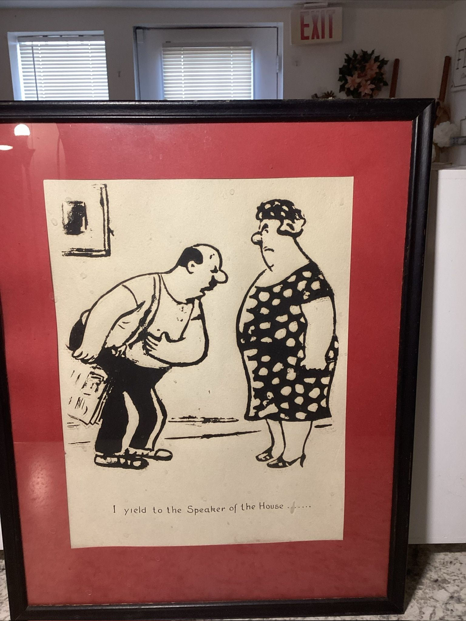 Vintage framed humor cartoon print featuring a comedic scene of a man bowing toward a woman with the caption “I yield to the Speaker of the House.” The illustration is done in classic black ink line art and displayed with a bold red mat and black frame. This witty piece has a political pun and vintage cartoon style that makes it a fun conversation piece for offices, studies, libraries, or anyone who enjoys satire and classic humor art.