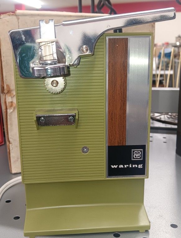 This is in the original box and is in like new condition. The Waring Electric Can Opener Sharpener Model 13-234 from the 1970s in Avocado Green is a vintage kitchen appliance that combines convenience and style. Made in Japan by the Waring brand, this unit is a unique find for collectors of retro small kitchen appliances. The green color and vintage style make it a charming addition to any kitchen, while its functionality as both a can opener and sharpener adds practicality to its aesthetic appeal