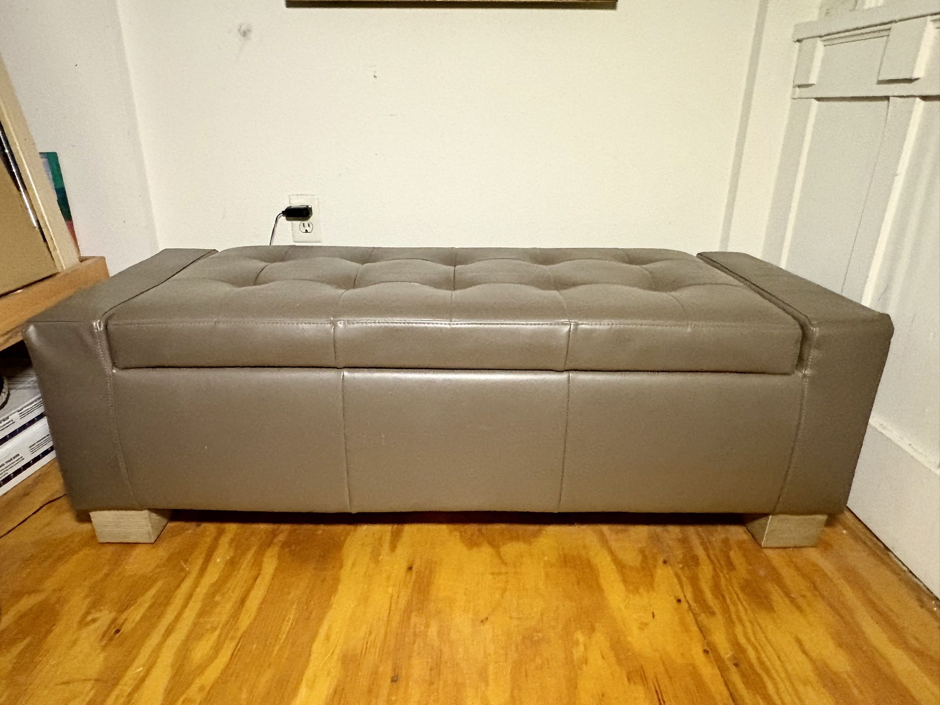 Multi-use leather bench with wooden legs/feet for sale. It’s in great condition. No rips or tears or stains or blemishes of any kind. The hydraulic hinges work quietly & effortlessly. I used it in the entryway for my shoes. But I am remodeling so this needs to find a new home. 50” width 20” depth 18” height When opened the storage area is ~10” deep and the backrest comes up to 33” high. Priced at half retail value. Cash only plz Pick up downtown