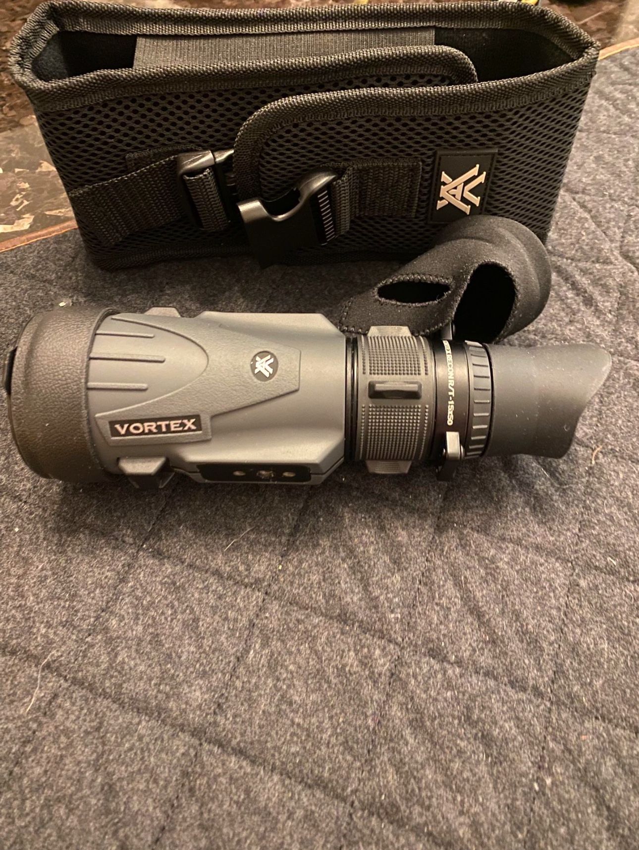 Never used. Comes with original box and paperwork. The Recon R/T is a unique, advanced tactical piece of equipment that is unlike any other in the fieldthe first truly compact, full-featured spotting scope developed especially for field surveillance and range estimating. The quick-handling, lightweight design features brilliant optical performance using Vortex premium XD glass and XR lens coatings. The versatile attachment clip secures the Recon R/T to any belt or strap for rapid deployment. The R/T ranging reticle using mrad-based subtensions also includes a secondary quick-ranging system with silhouettes. Features of the Vortex Recon R/T XD Lens Elements XR Fully Multi-Coated lenses Phase Correction for enhanced resolution Roof Prism for greater durability and more compact size Waterproof Fog proof ArmorTek scratch-resistant exterior lens coating Rubber Armor