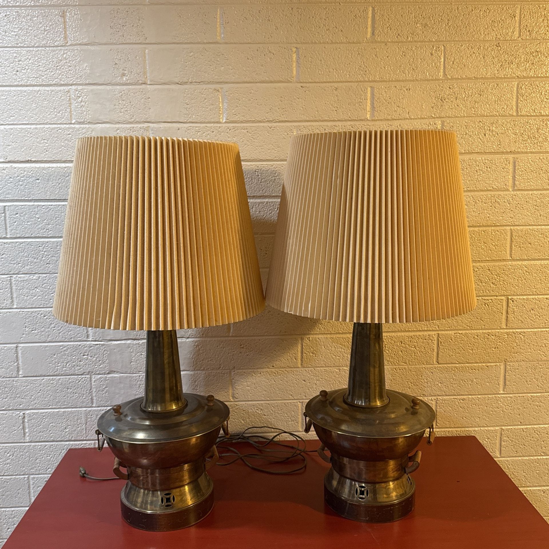 Matching set of vintage Paul Hanson table lamps featuring brass and wood bases with original pleated fabric shades. Both lamps are in working condition and offer classic mid-century character — perfect for vintage décor or a collector. Asking $200 OBO for the pair.