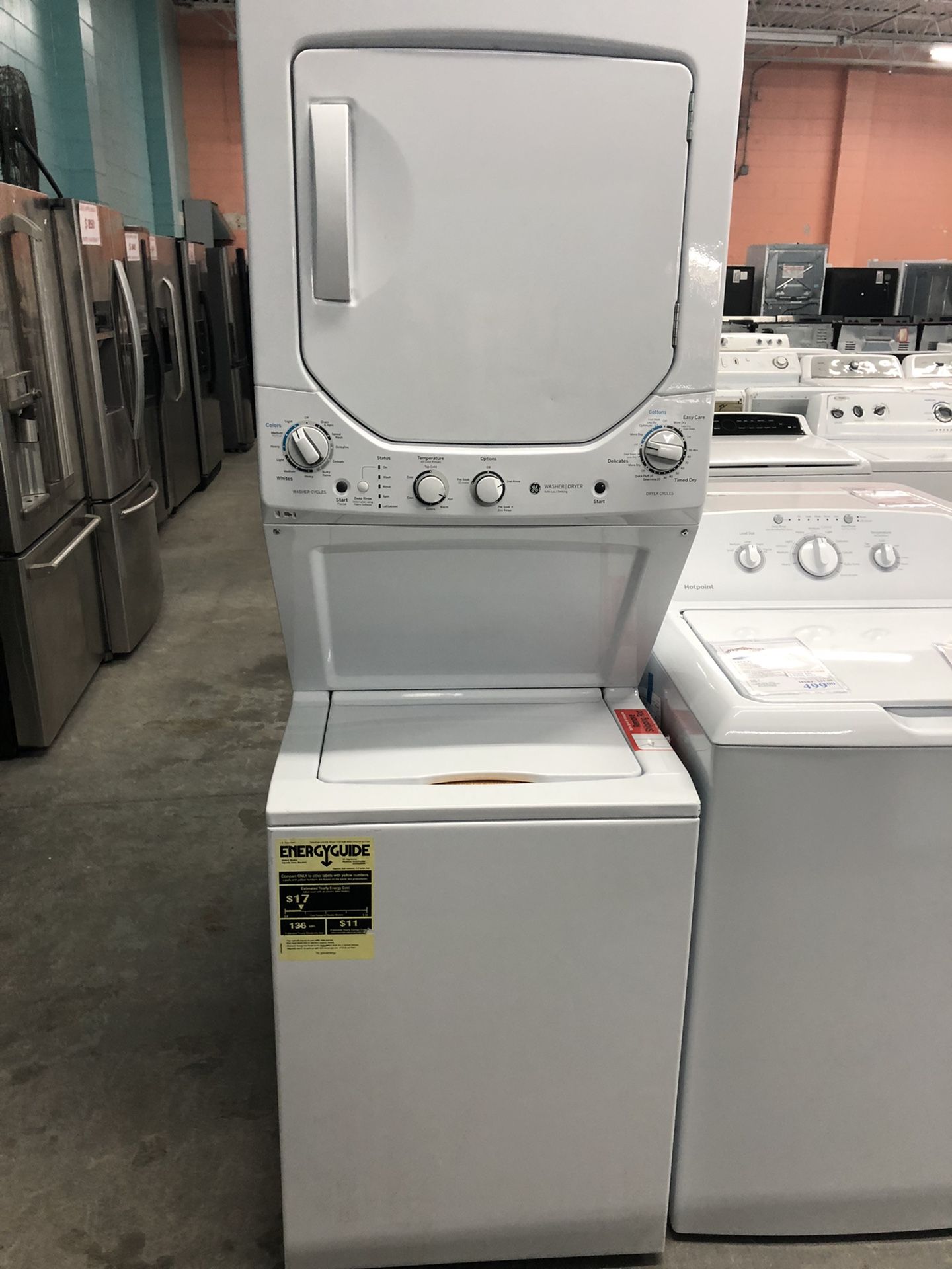 Brand new GE 24” stack washer dryer model number GUD24ESSMWW. Washer has 11 cycles 6 wash/rinse temperatures optional pre soak extra rinse and has stainless tub. Dryer 4 cycles easy access lint filter and dewrinkle. Big box stores sell for 1300.00. Comes with factory warranty.