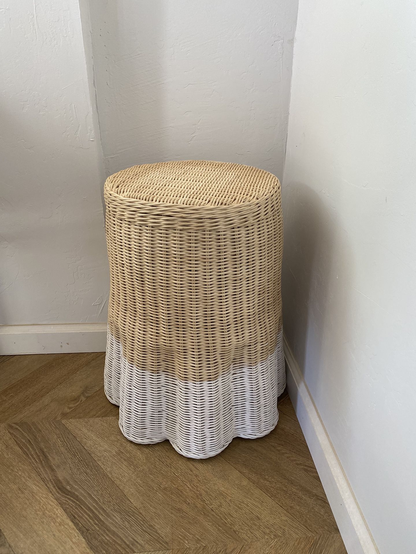 Scalloped coastal woven/ rattan end table. See photos for measurements and what this retails brand new. Rattan Wicker Scalloped Cottage core Polynesian decor Serena and Lily West elm Crate and barrel Woven Natural materials Vintage Antique Coquette Coastal Beach