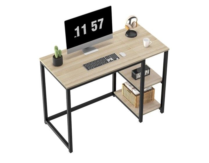 40'' Oak Computer Desk with Shelves, Sturdy Light Wood Desks with Storage Space, Modern Gaming Desk Study Writing Laptop Table, Beige