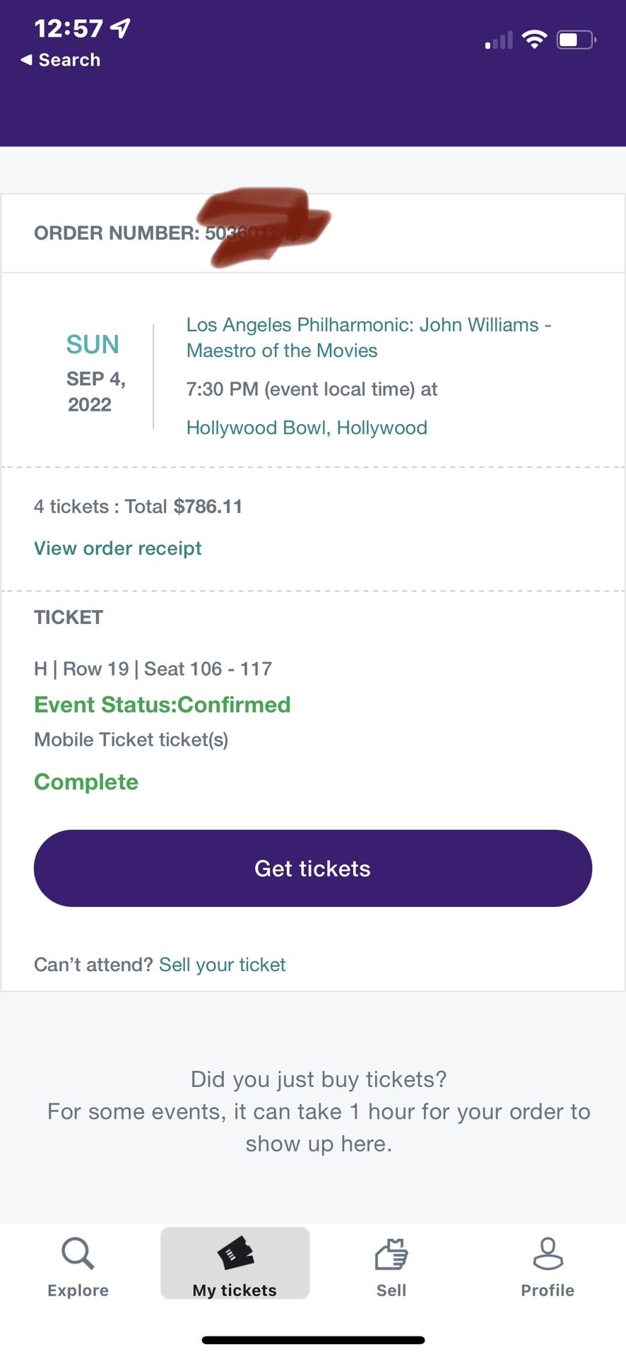 TONIGHT SUN Sept 4th JOHN WILLIAMS PHILHARMONIC AT HOLLYWOOD BOWL Seats H Row 19 106-117 (next to each other) Bought but we can’t attend unfortunately. Must have StubHub account to transfer tickets. Digital only. No prints will be accepted at venue.