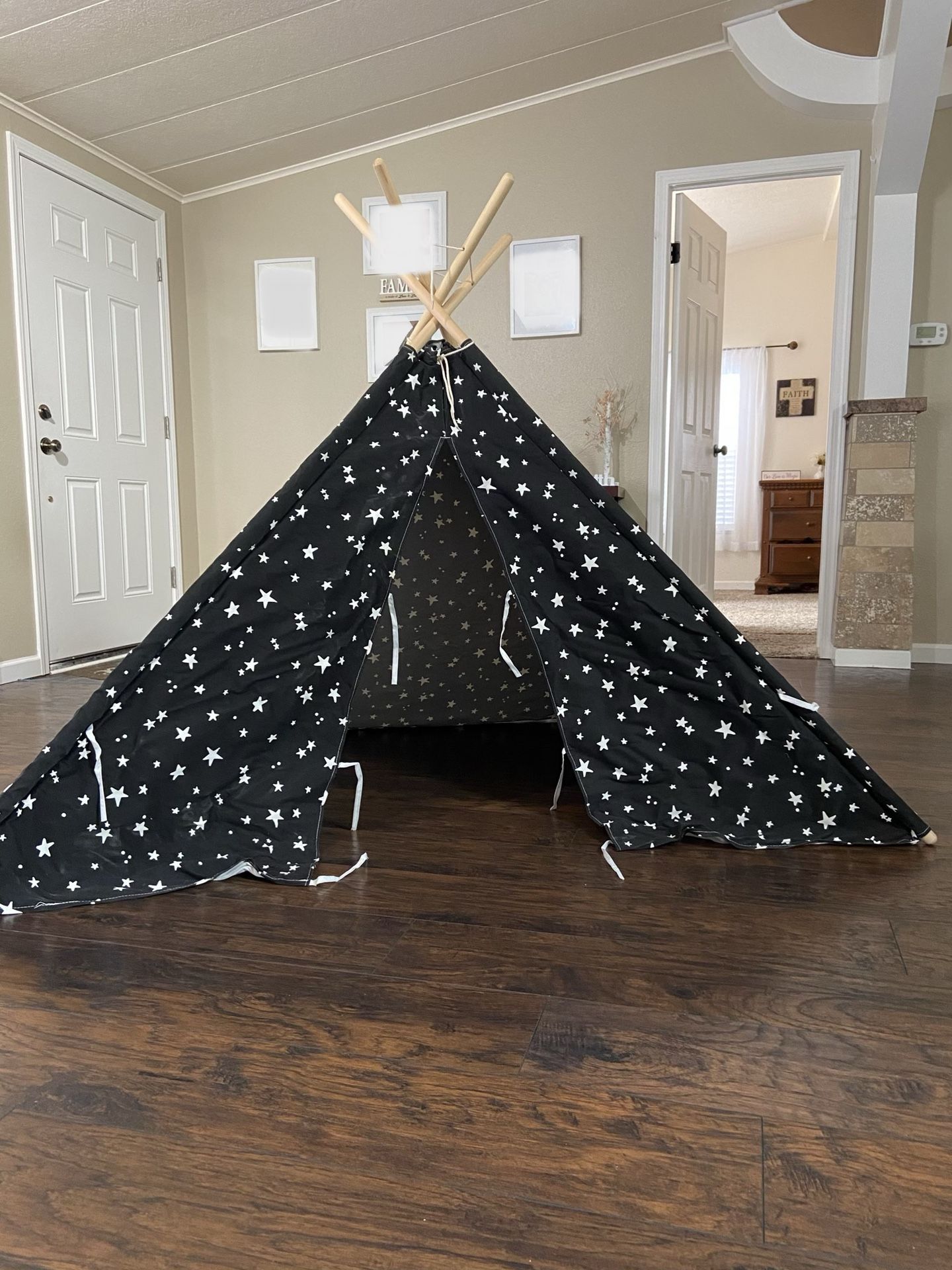 Black w/stars teepee. Originally bought from target for $70. Has only been used once for a Children’s party. Can be used indoors and outdoors. Can be used in a children’s bedroom, living-room, toy room, etc. Made of thick canvas material, very durable. Easily assembled. Comes with original packaging/storing pouch. 4’8” feet tall 58 in L x 58 in W x 56 in H 147.3 cm x 147.3 cm x 142.2 cm hablo español :)