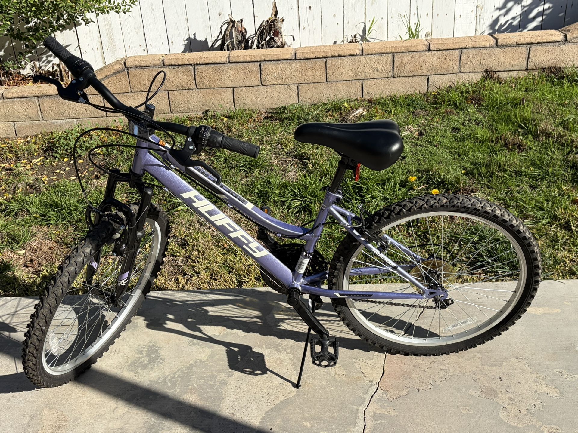 Need a new tube or patch. Durable Frame: Steel frame built to withstand rugged mountain adventures. Smooth Ride: Suspension fork absorbs shocks for a comfortable ride. Eye-Catching Design: Purple and lilac design with vibrant, eye-catching graphics. Versatile Gears: 18-speed twist shifter for easy gear changes on any terrain. Strong Traction: Knobby tires provide strong traction on rough trails. Comfortable Saddle: Padded saddle ensures comfort during long rides. Reliable Brakes: Front and rear linear pull brakes offer solid stopping power. Adjustable Seat: Slim ATB saddle with alloy quick-release seat binder for easy adjustments.