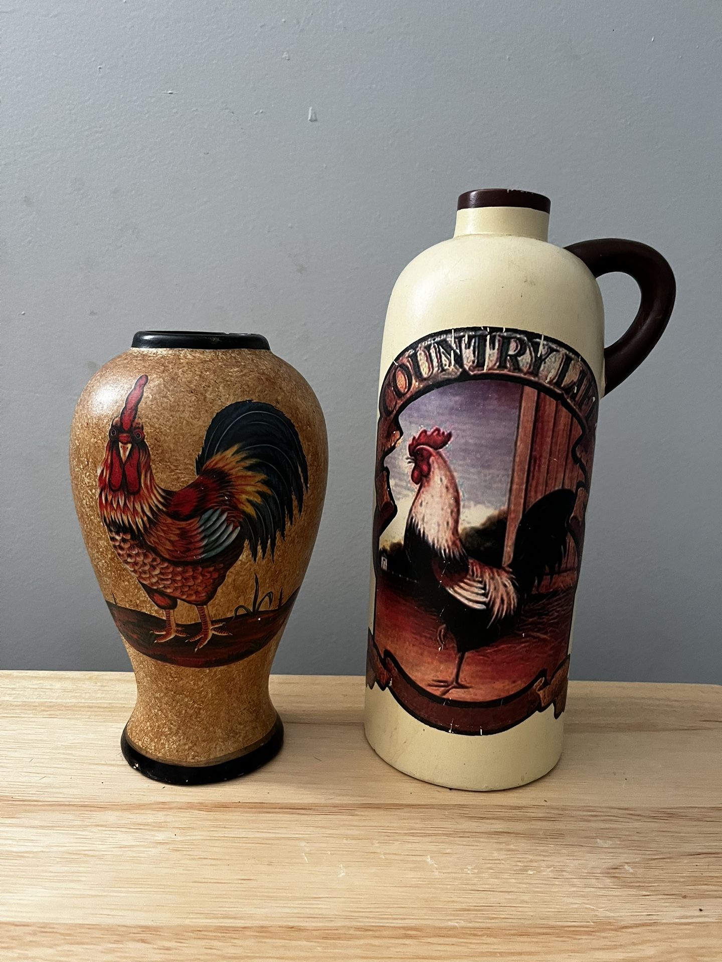 Hey there! I'm selling a super cute rustic decor set with a vase and jug that have awesome rooster designs. The vase is 8 inches tall and the jug is 14 inches - perfect for adding a country touch to your home. You can buy both for $15 or snag them individually for $10 each.