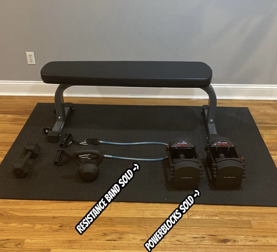 Hudson Steel Flat Bench w/ Gym Mat, 25 Lb Kettle Bell, & 20 Lb Dumbbell