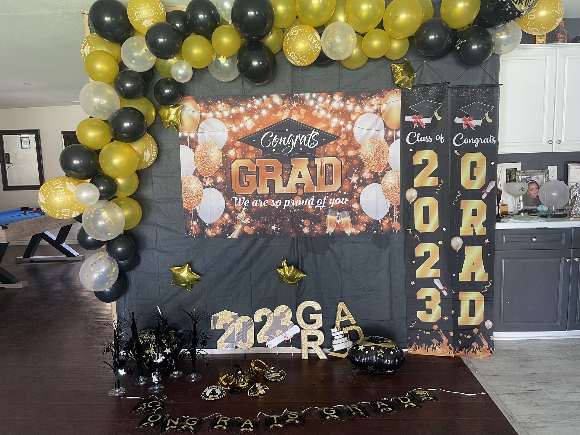 Graduation backdrop…. Graduation hanging banners… graduation yard signs with stakes… graduation hanging decorations… 5 grad center pieces Asking $25