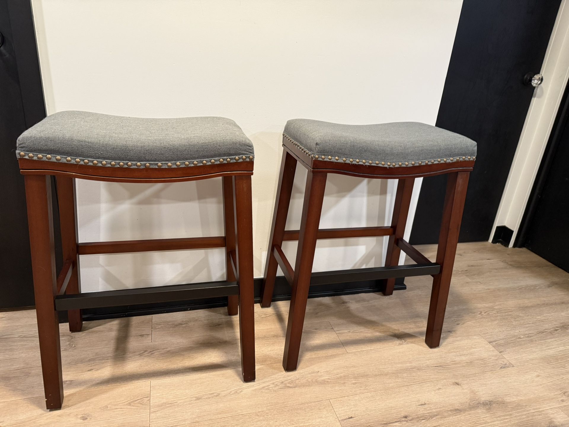 2 Bar stools In great condition. Hardly used cause we went with leather instead. Built and ready to use. Color is dk grey. Dimensions- 30” high 20” wide 12” deep