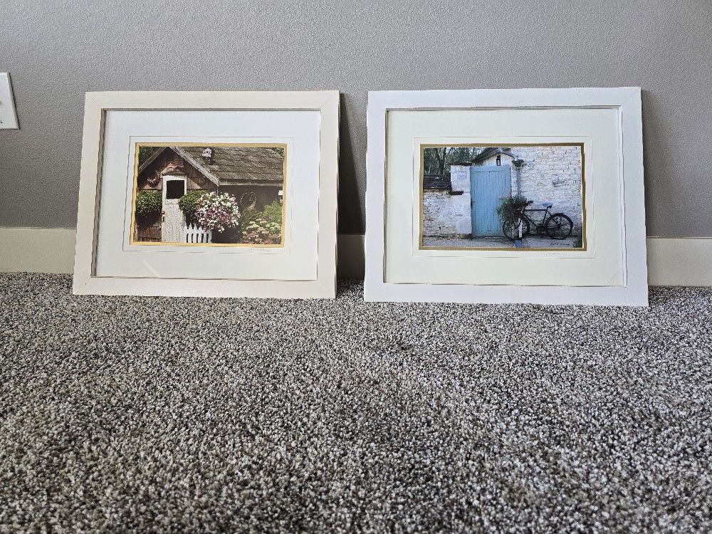 These two wood framed with glass country pictures measure 12" x 15" each and are in perfect condition. Will sell separately @ $15 each or both for $20.
