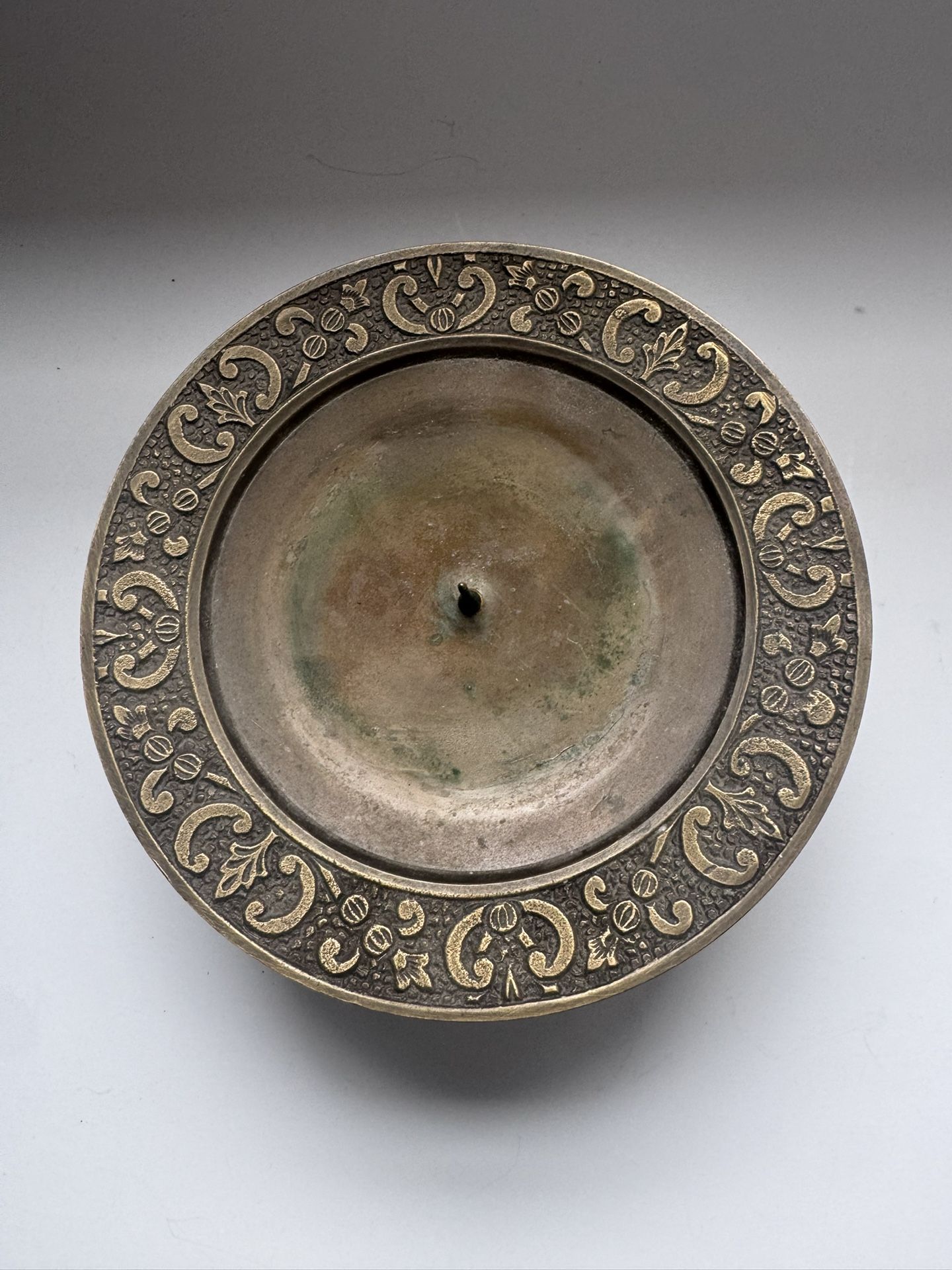 Vintage footed brass candlestick holder. Has intricate design on the base. Has made in India sticker present. 3” tall 6” wide at base