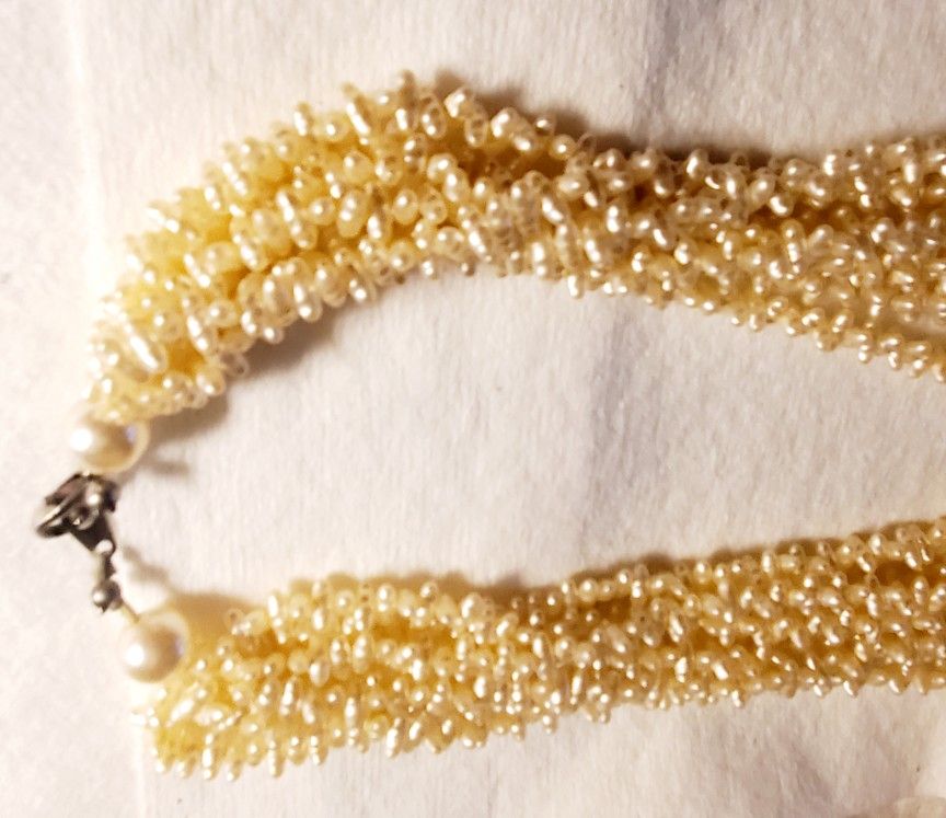 Vintage Victorian style satoire necklace with 7 strands of natural seed pearls and a silver-tone clasp.