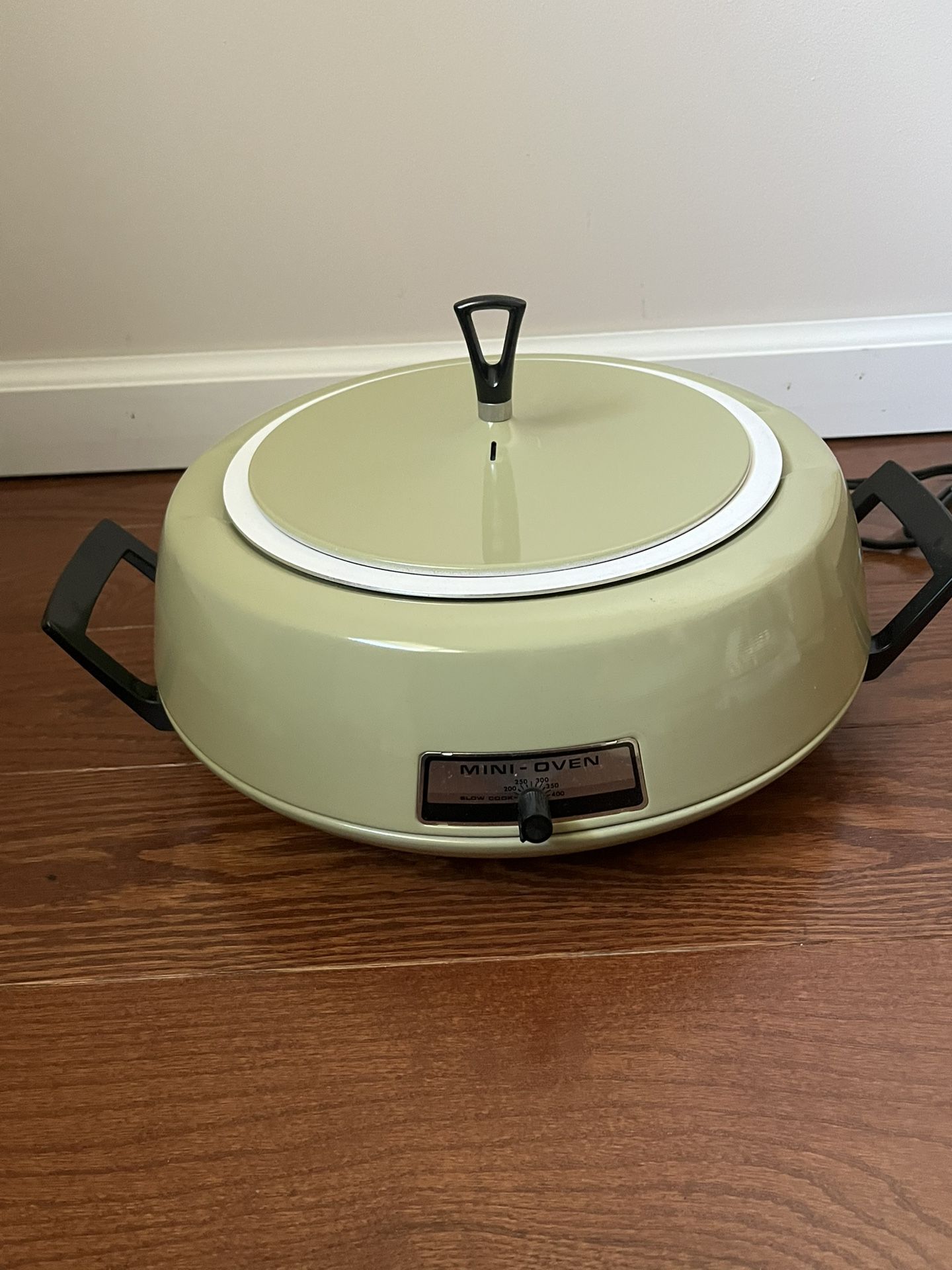 Embrace the charm of the retro kitchen with the Mirro-Matic Bake and Serve Electric Pot. With a vintage aesthetic that's sure to delight, this 3-quart green pot brings a touch of the past to your modern kitchen. Its durable construction and 600 W power output make it both a functional and stylish addition. Crafted in the United States, the model M-0359-77 reflects a era when appliances were built to last. Whether you're whisking up a batch of your favorite cookies or serving dishes with ease, this electric pot is designed for convenience and enduring quality. 23 Mike
