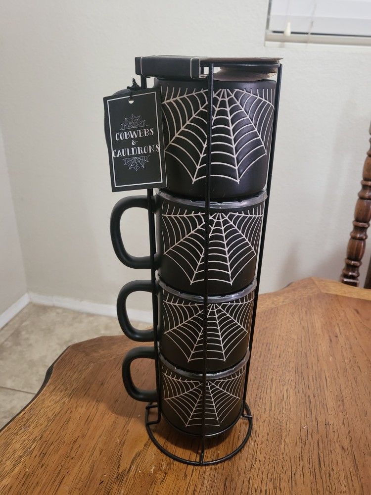Halloween stackable mugs set. Black with white spider web. Brand new has never been used or open. Cobwebs and cauldrons brand