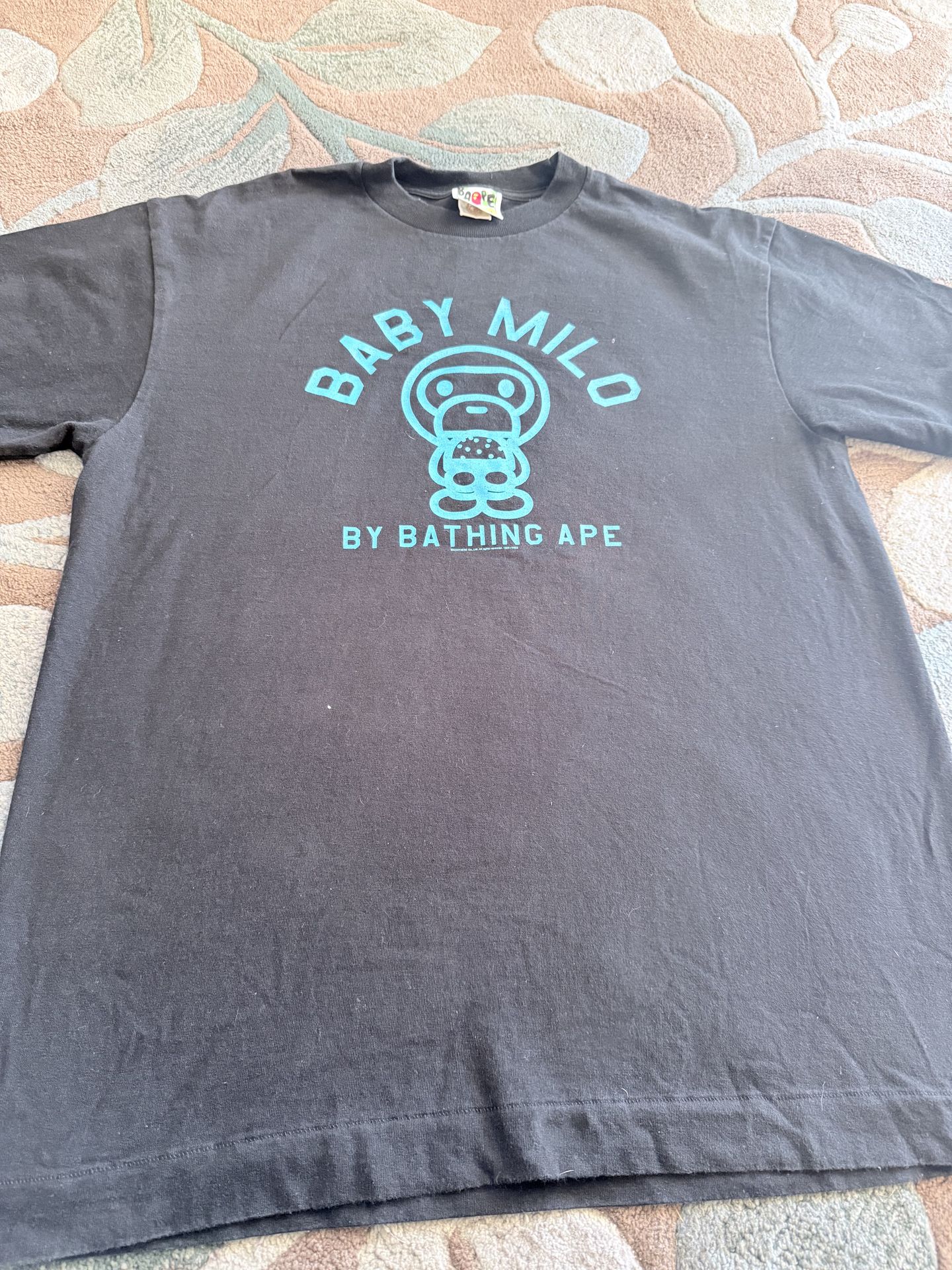 Baby Milo by A Bathing Ape black crewneck shirt – Size Large. • Teal Baby Milo front graphic • “By Bathing Ape” logo text • Back neck logo detail • Size: Large (See photos for exact measurements.) Condition: Pre-owned. Light wear from normal use. No major rips or heavy stains. Clean everyday streetwear piece — easy to style. Serious inquiries only.