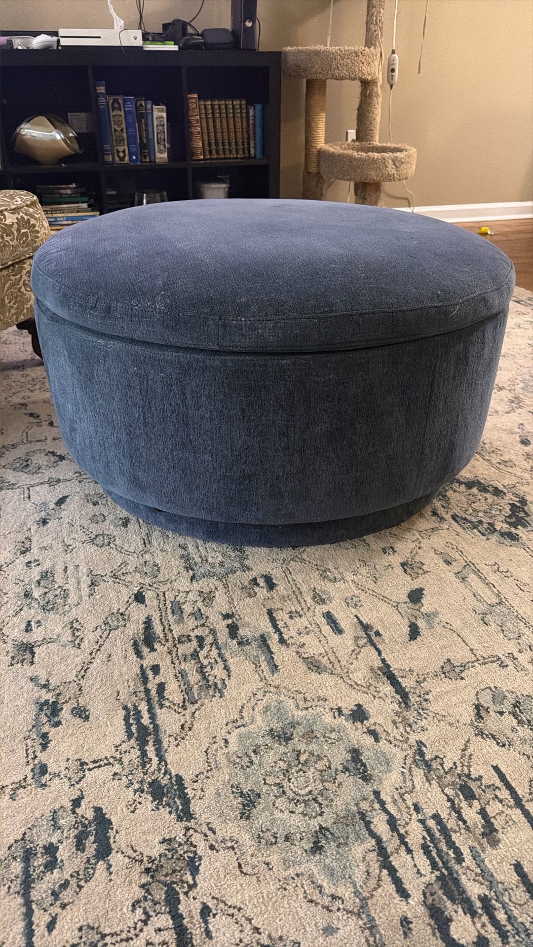 A storage’s ottoman that spins, perfect for storing extra pillows or blankets. Measurements are 36”x 15”