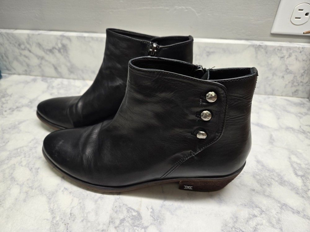 Beautiful, black leather, wear-everywhere, stacked heel style Sam Edelman booties. Heel Height: 1.8 inches Toe: Rounded Toe Boot Shaft: 4.7 inches Calf Circumference: 10 inches Material: Leather Insole: Synthetic